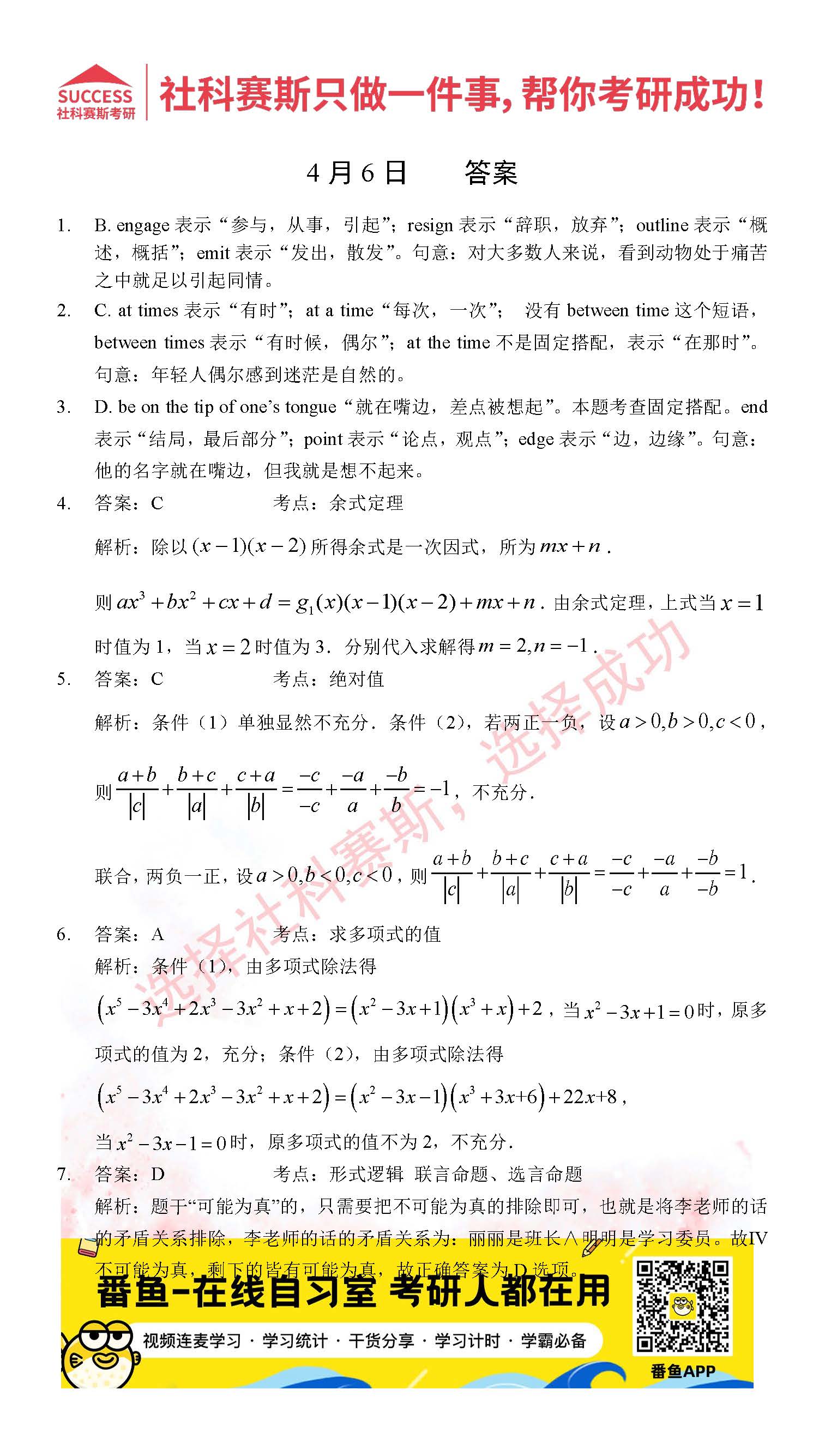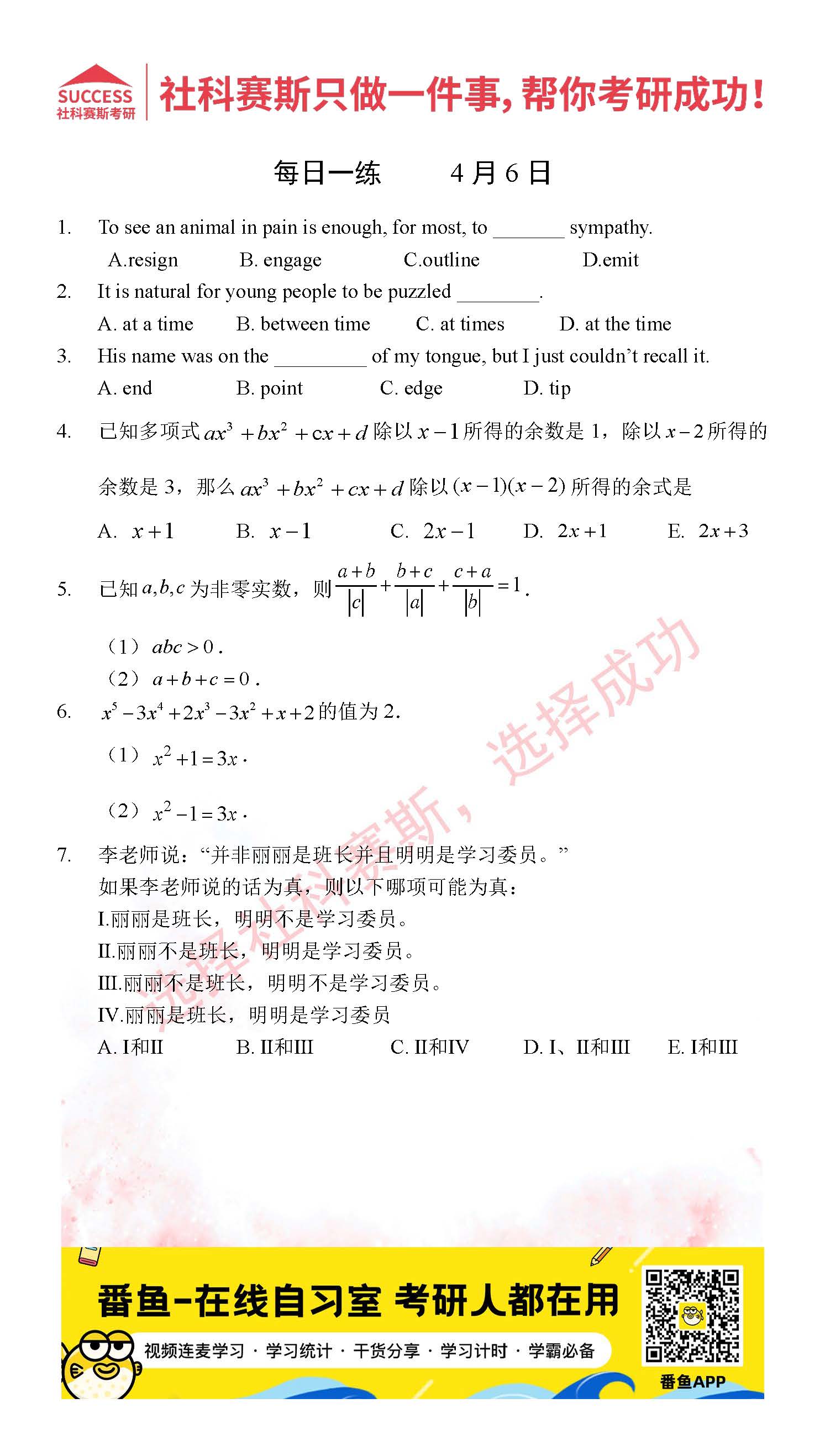 導(dǎo)讀:考研是一場持久戰(zhàn),保持良好的學(xué)習(xí)習(xí)慣,是能確保復(fù)習(xí)高效的關(guān)鍵。今天社科賽斯MBA備考網(wǎng)小編整理了“2022管理類聯(lián)考4月6日每日一練及答案”的內(nèi)容,希望能對廣大考生有所幫助。