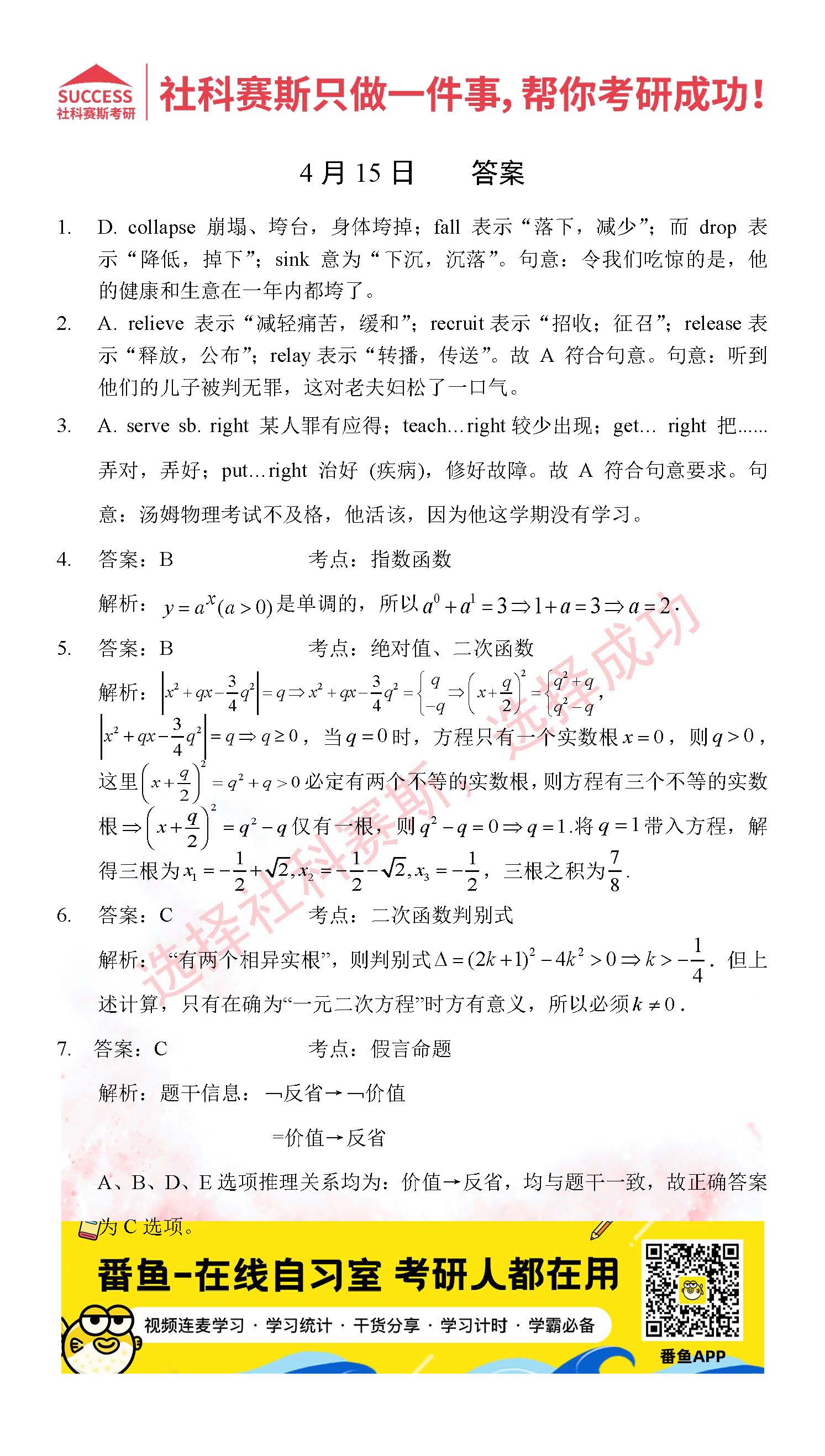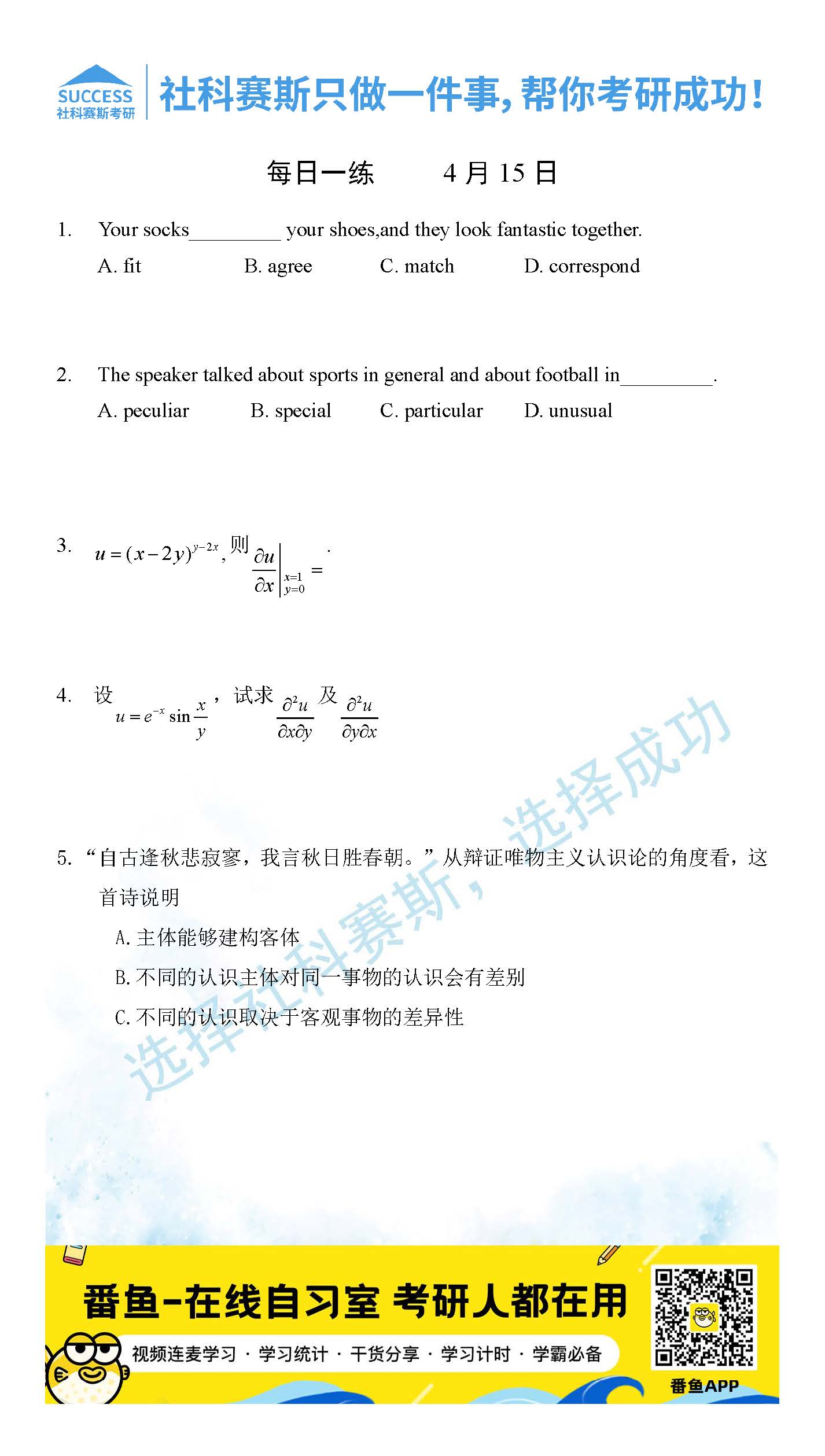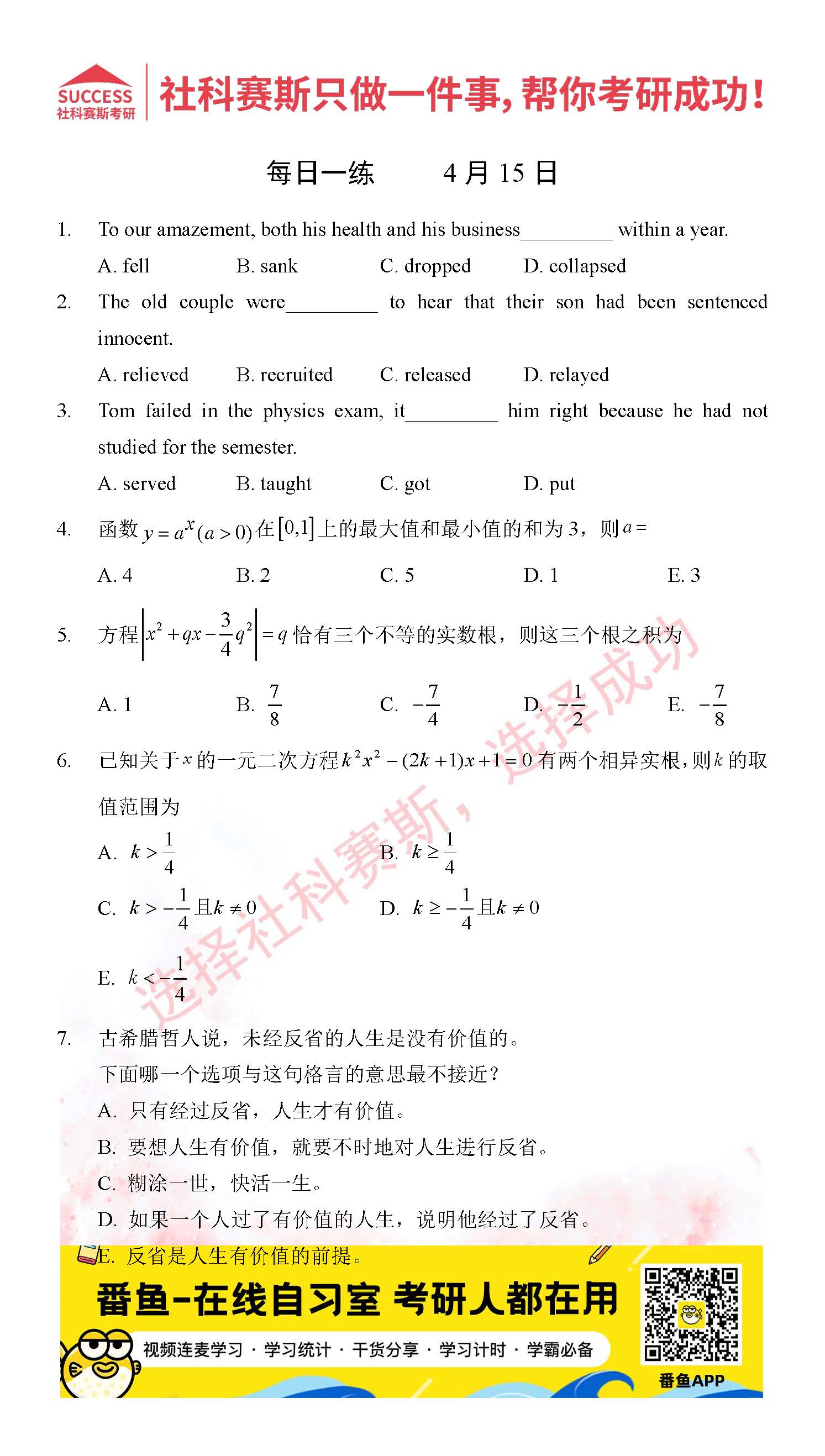 導(dǎo)讀:考研是一場(chǎng)持久戰(zhàn),保持良好的學(xué)習(xí)習(xí)慣,是能確保復(fù)習(xí)高效的關(guān)鍵。今天社科賽斯MBA備考網(wǎng)小編整理了“2022管理類聯(lián)考4月15日每日一練及答案”的內(nèi)容,希望能對(duì)廣大考生有所幫助。