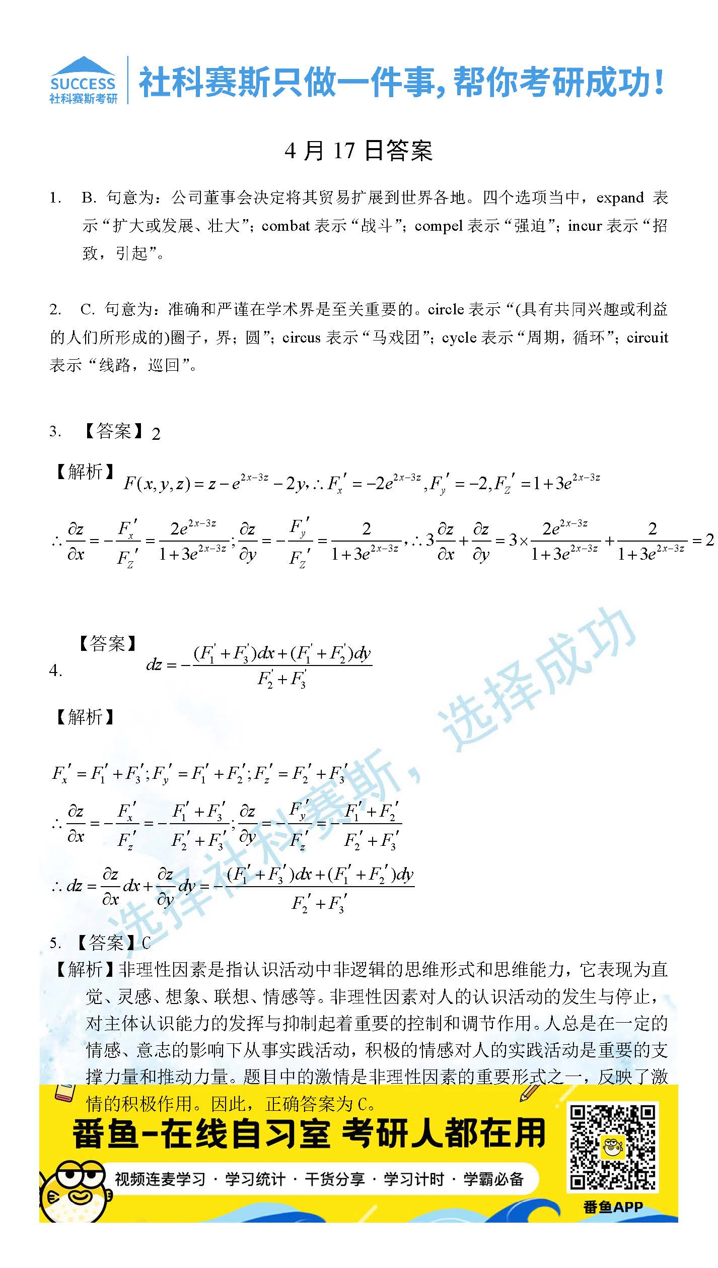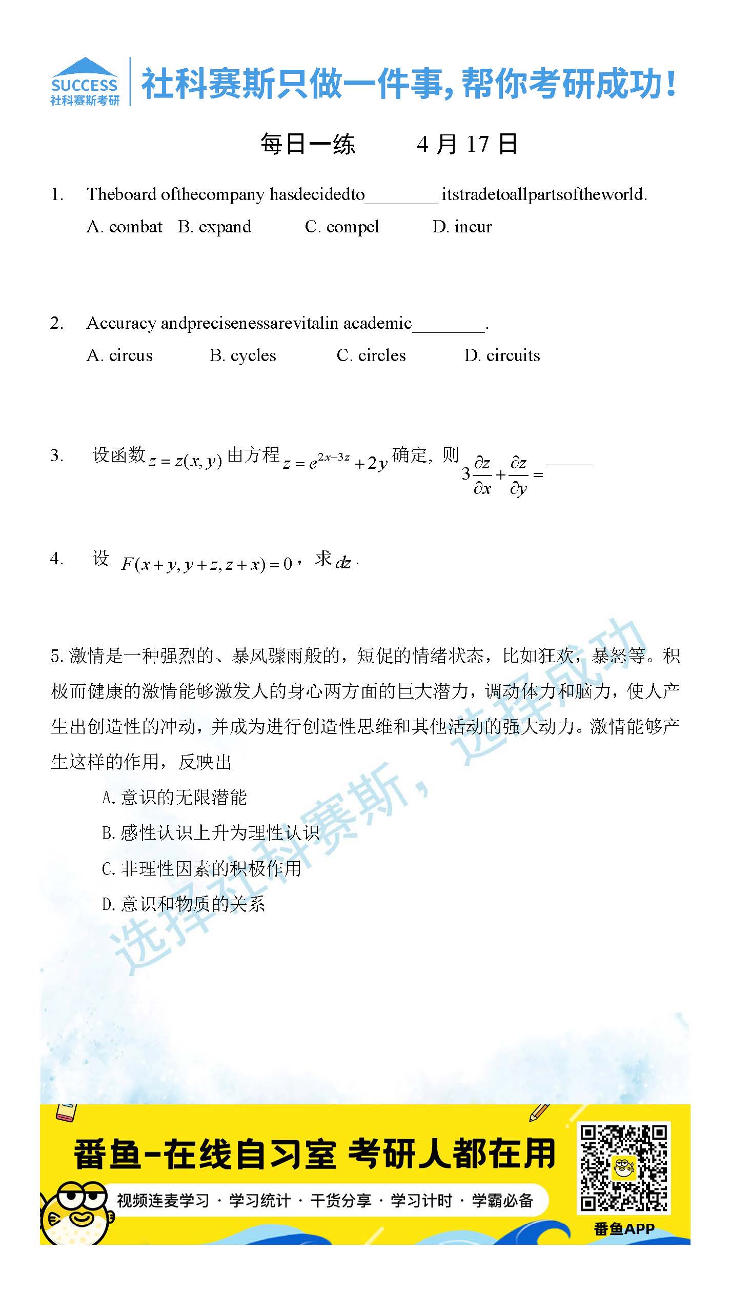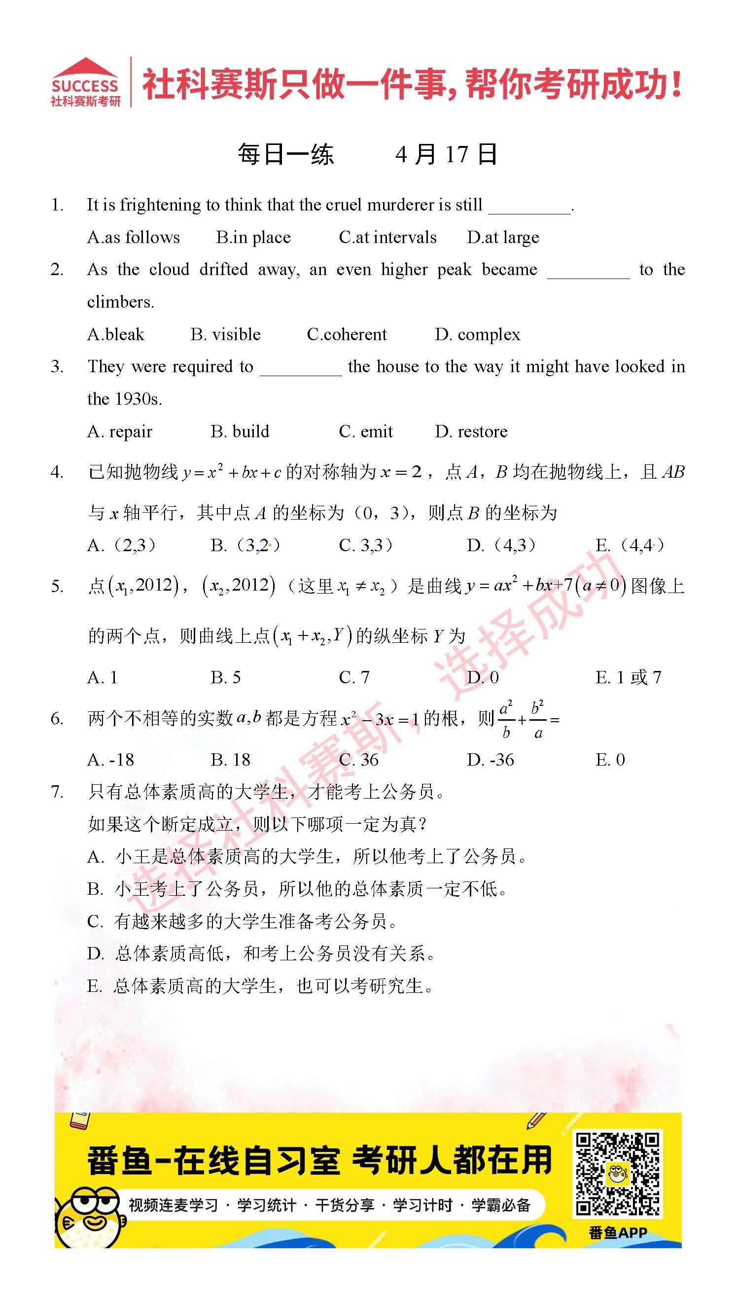 導(dǎo)讀:考研是一場(chǎng)持久戰(zhàn),保持良好的學(xué)習(xí)習(xí)慣,是能確保復(fù)習(xí)高效的關(guān)鍵。今天社科賽斯MBA備考網(wǎng)小編整理了“2022管理類聯(lián)考4月17日每日一練及答案”的內(nèi)容,希望能對(duì)廣大考生有所幫助。