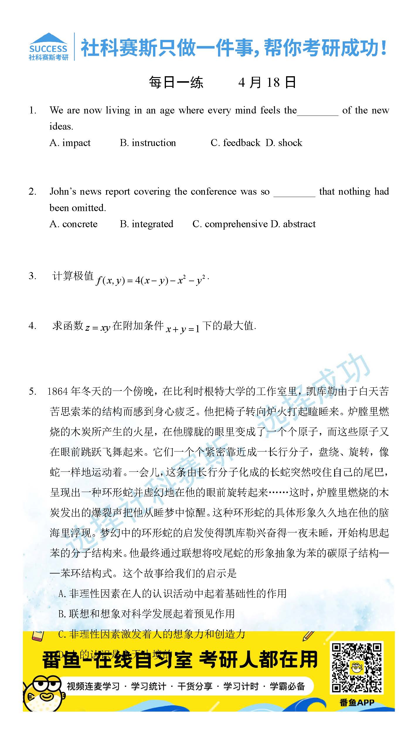導(dǎo)讀:考研是一場持久戰(zhàn),保持良好的學(xué)習(xí)習(xí)慣,是能確保復(fù)習(xí)高效的關(guān)鍵。今天社科賽斯MBA備考網(wǎng)小編整理了“2022管理類聯(lián)考4月18日每日一練及答案”的內(nèi)容,希望能對廣大考生有所幫助。