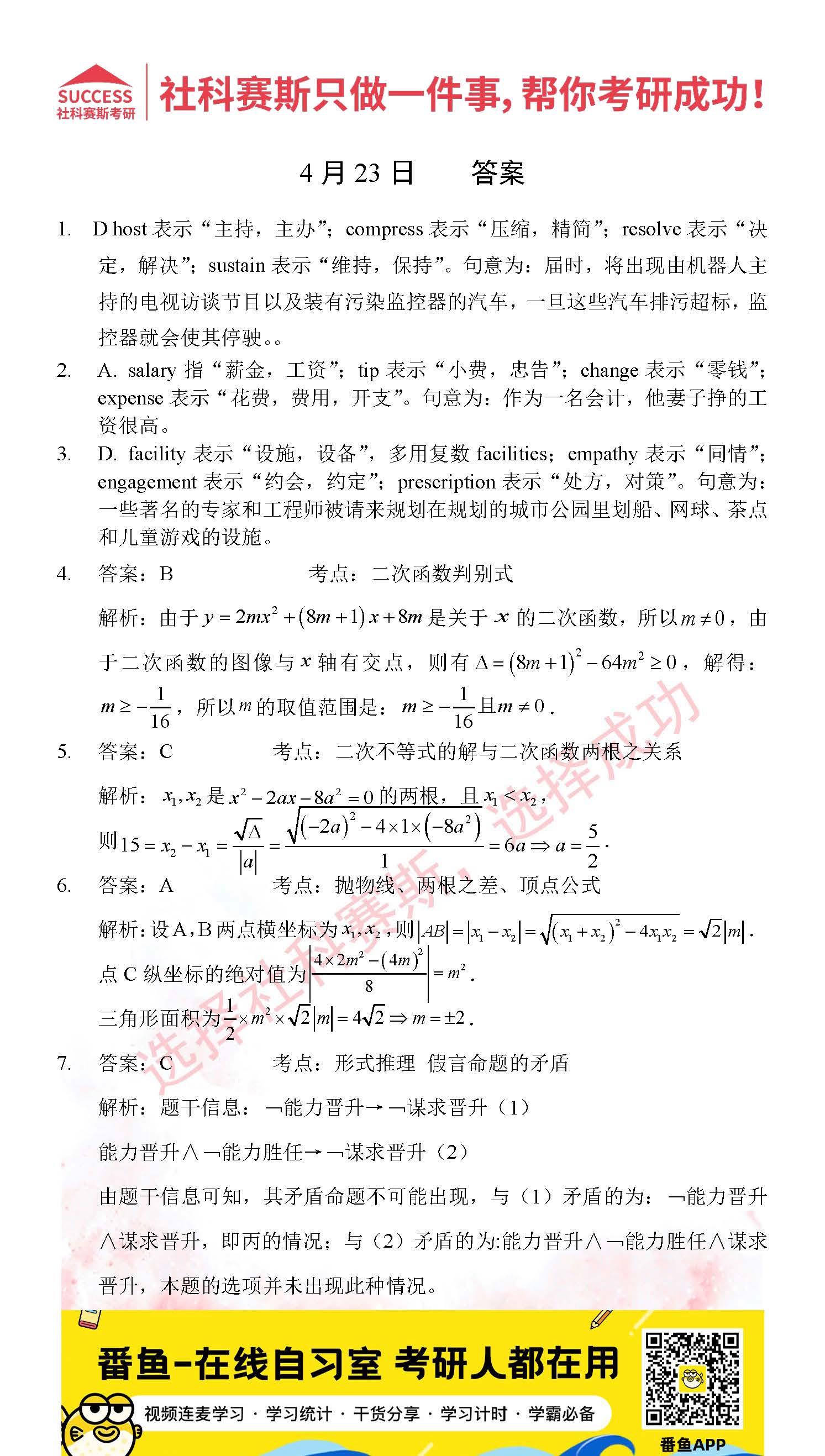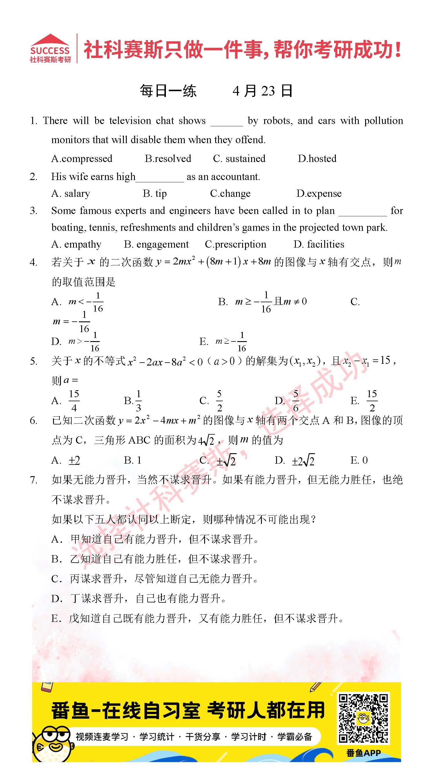 導(dǎo)讀:考研是一場(chǎng)持久戰(zhàn),保持良好的學(xué)習(xí)習(xí)慣,是能確保復(fù)習(xí)高效的關(guān)鍵。今天社科賽斯MBA備考網(wǎng)小編整理了“2022管理類聯(lián)考4月23日每日一練及答案”的內(nèi)容,希望能對(duì)廣大考生有所幫助。
