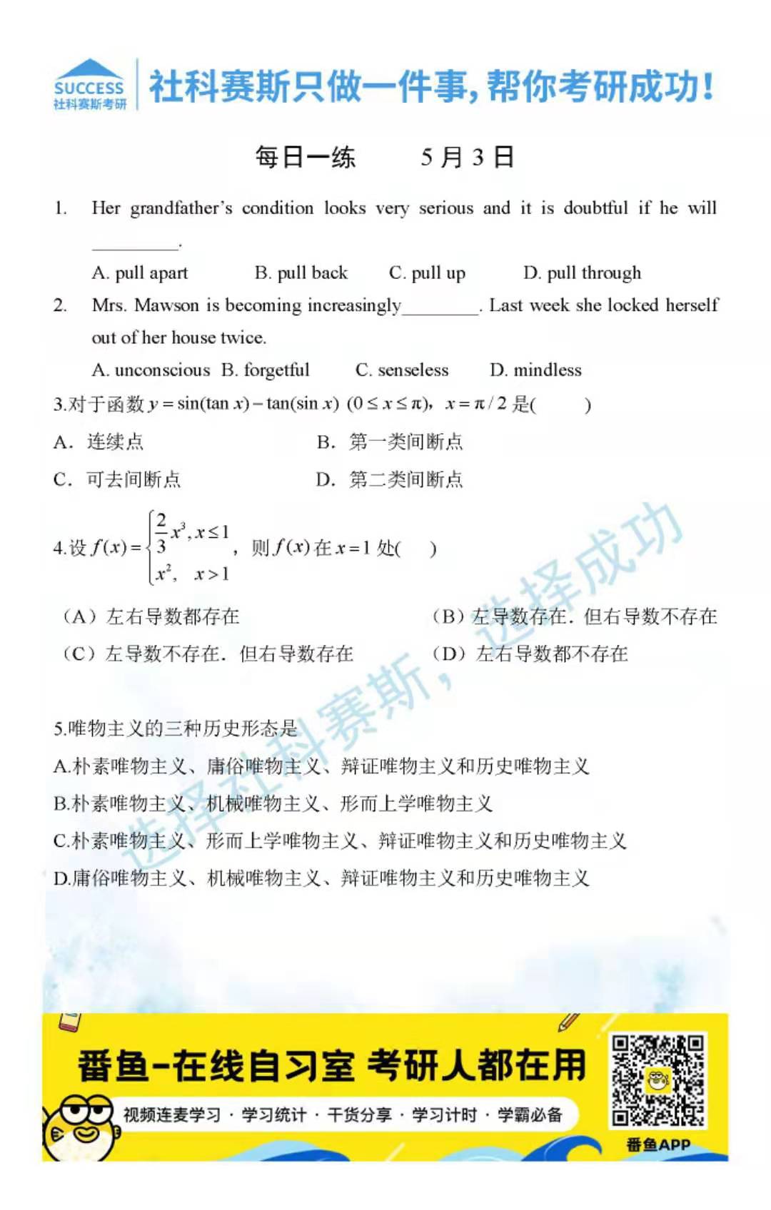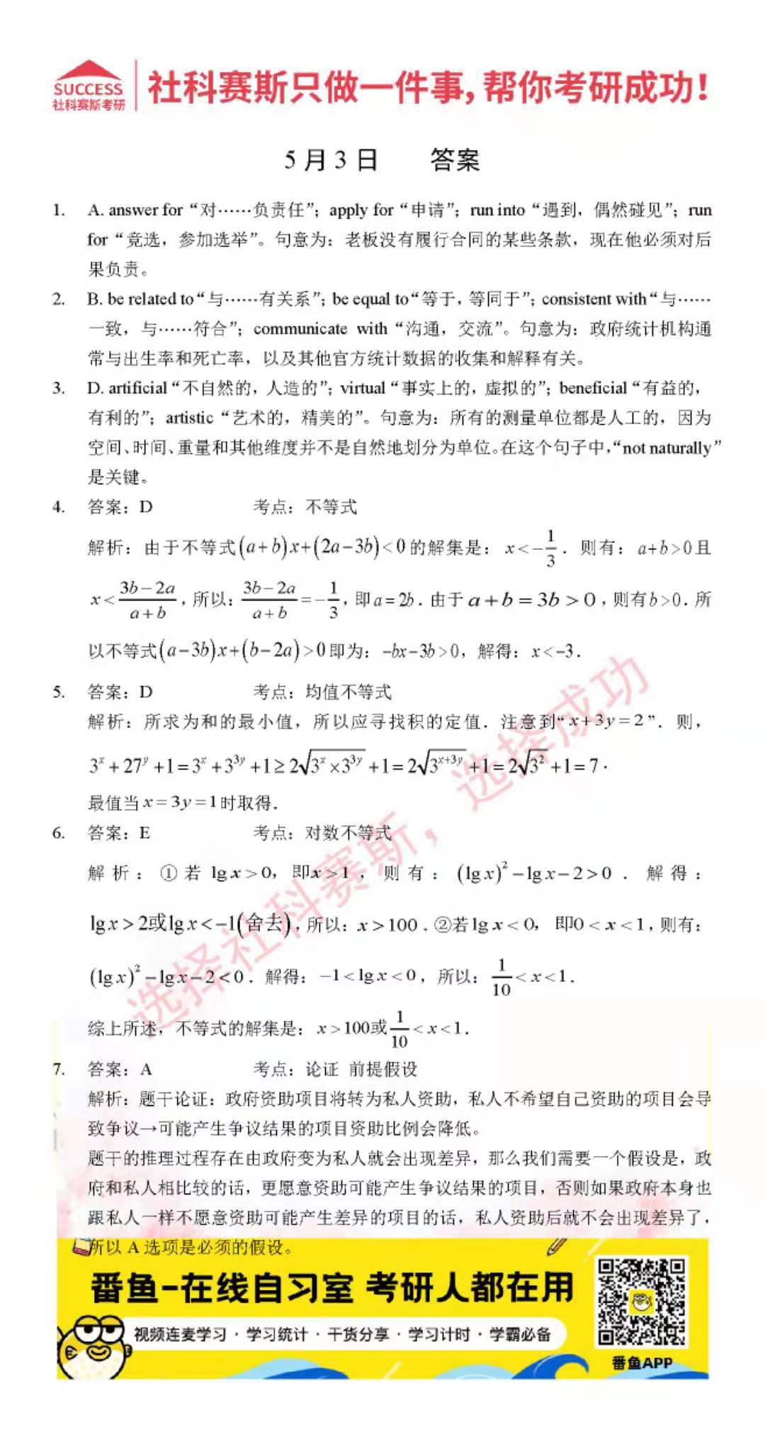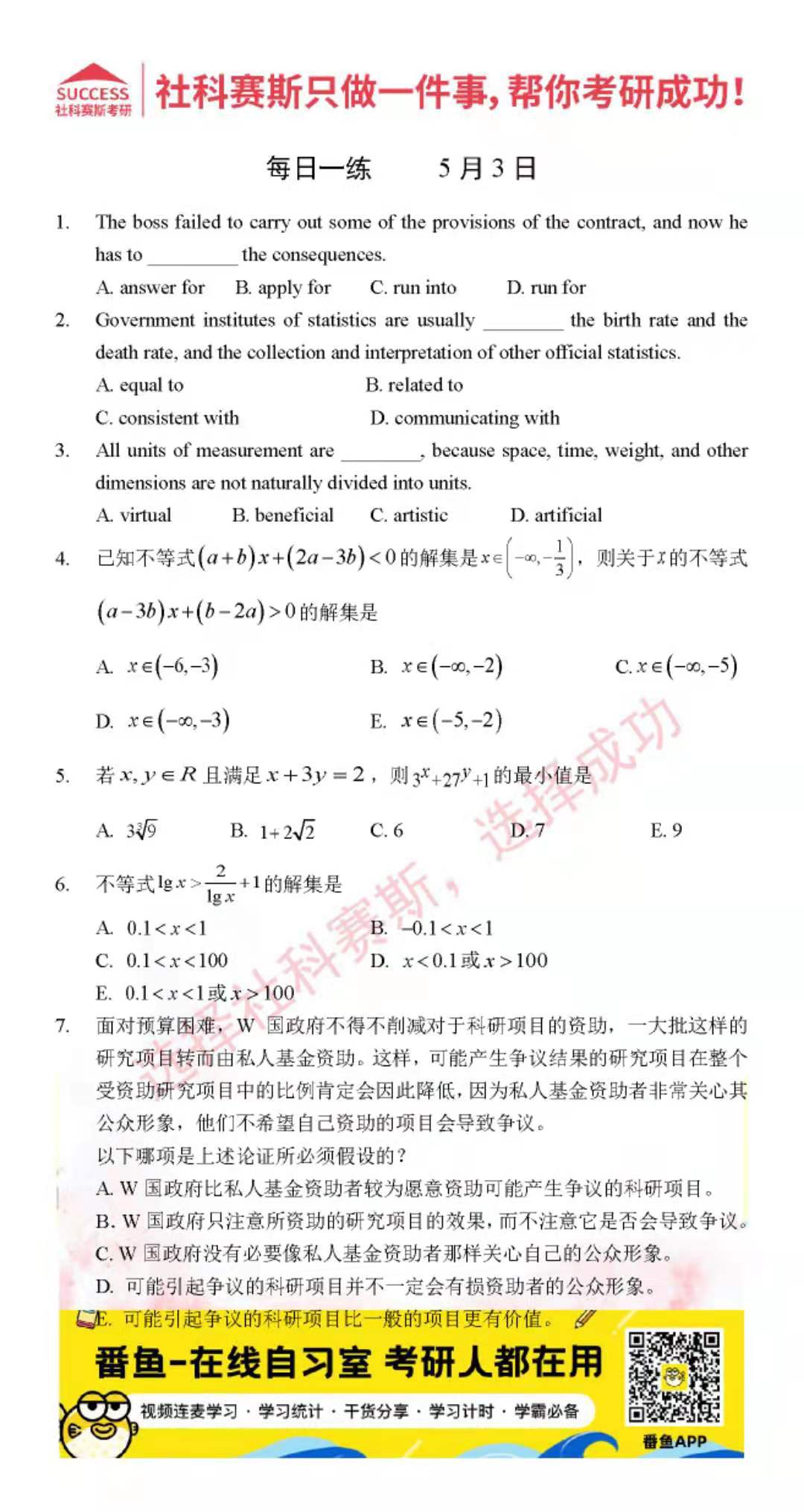 導(dǎo)讀:考研是一場(chǎng)持久戰(zhàn),保持良好的學(xué)習(xí)習(xí)慣,是能確保復(fù)習(xí)高效的關(guān)鍵。今天社科賽斯MBA備考網(wǎng)小編整理了“2022管理類(lèi)聯(lián)考5月3日每日一練及答案”的內(nèi)容,希望能對(duì)廣大考生有所幫助。