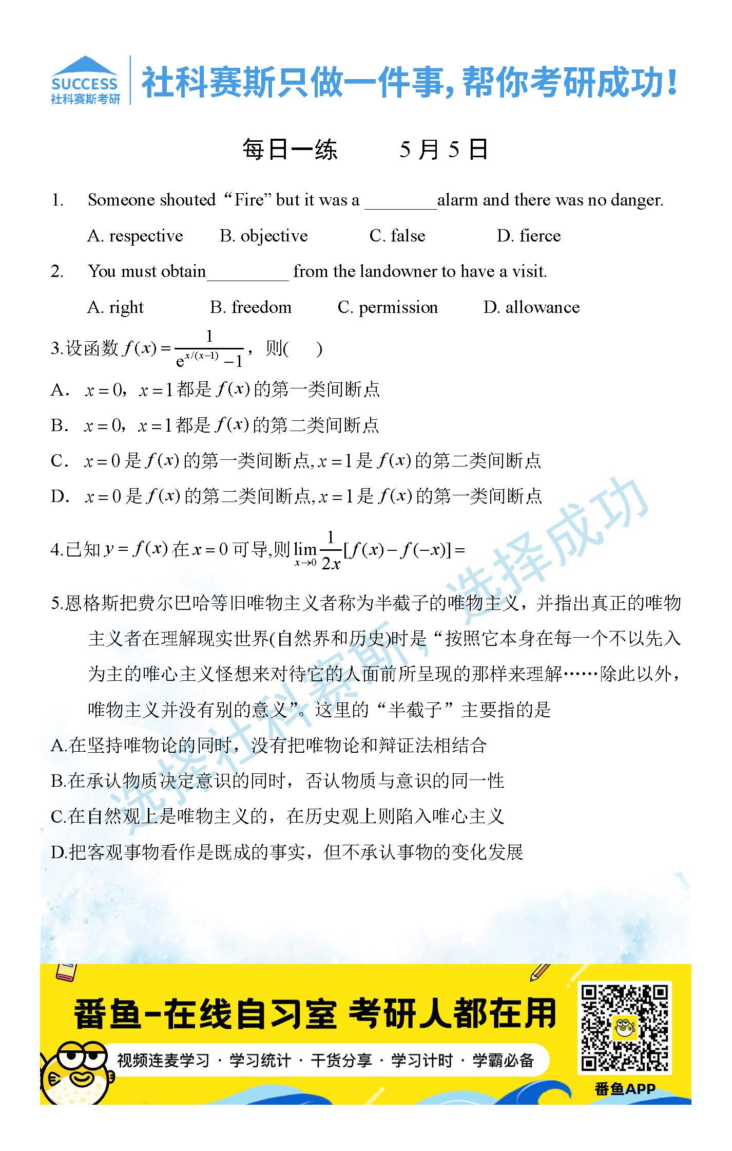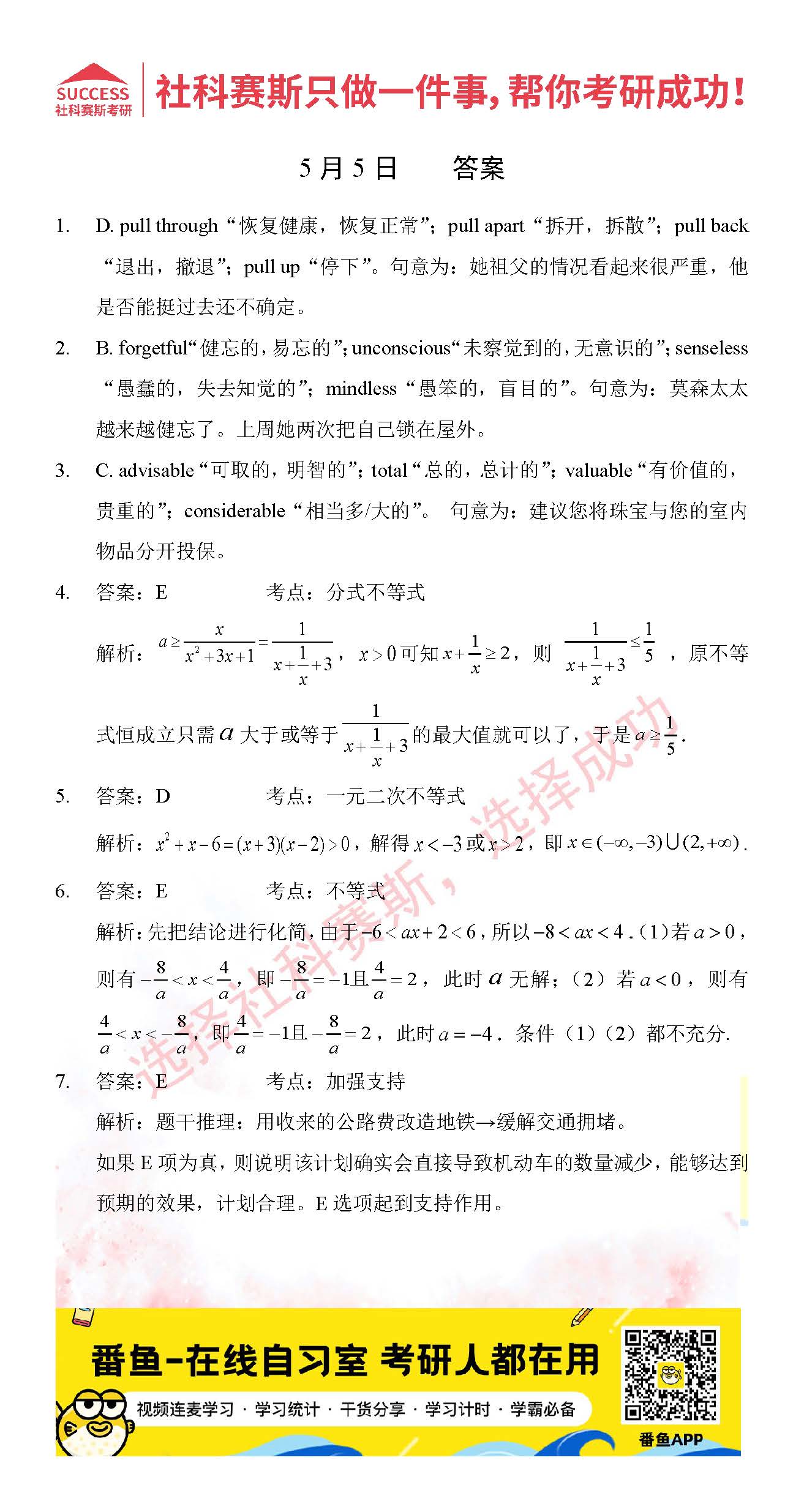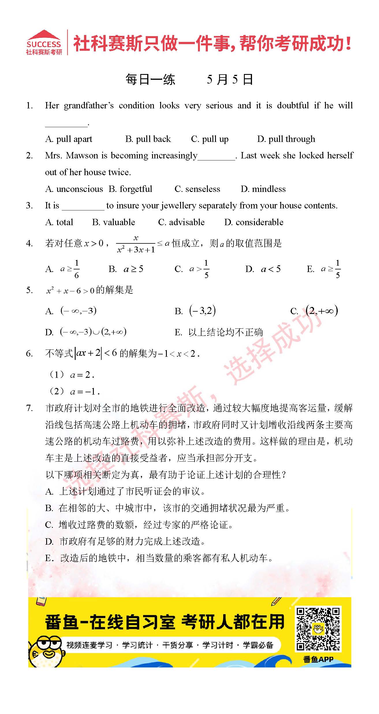 導(dǎo)讀:考研是一場持久戰(zhàn),保持良好的學(xué)習(xí)習(xí)慣,是能確保復(fù)習(xí)高效的關(guān)鍵。今天社科賽斯MBA備考網(wǎng)小編整理了“2022管理類聯(lián)考5月5日每日一練及答案”的內(nèi)容,希望能對廣大考生有所幫助。