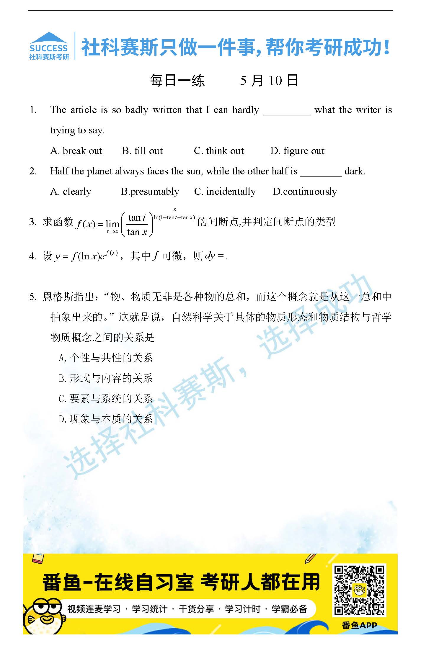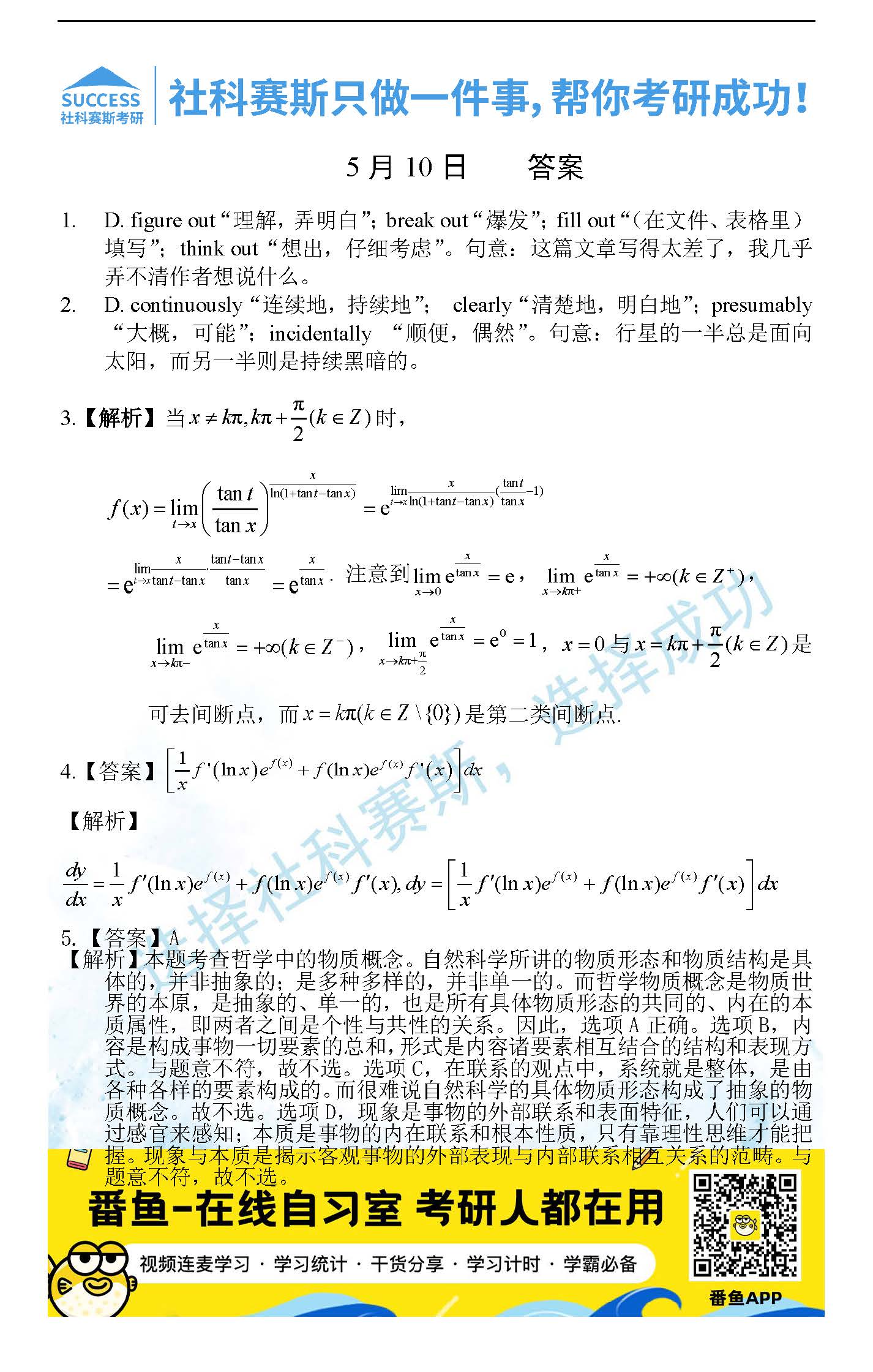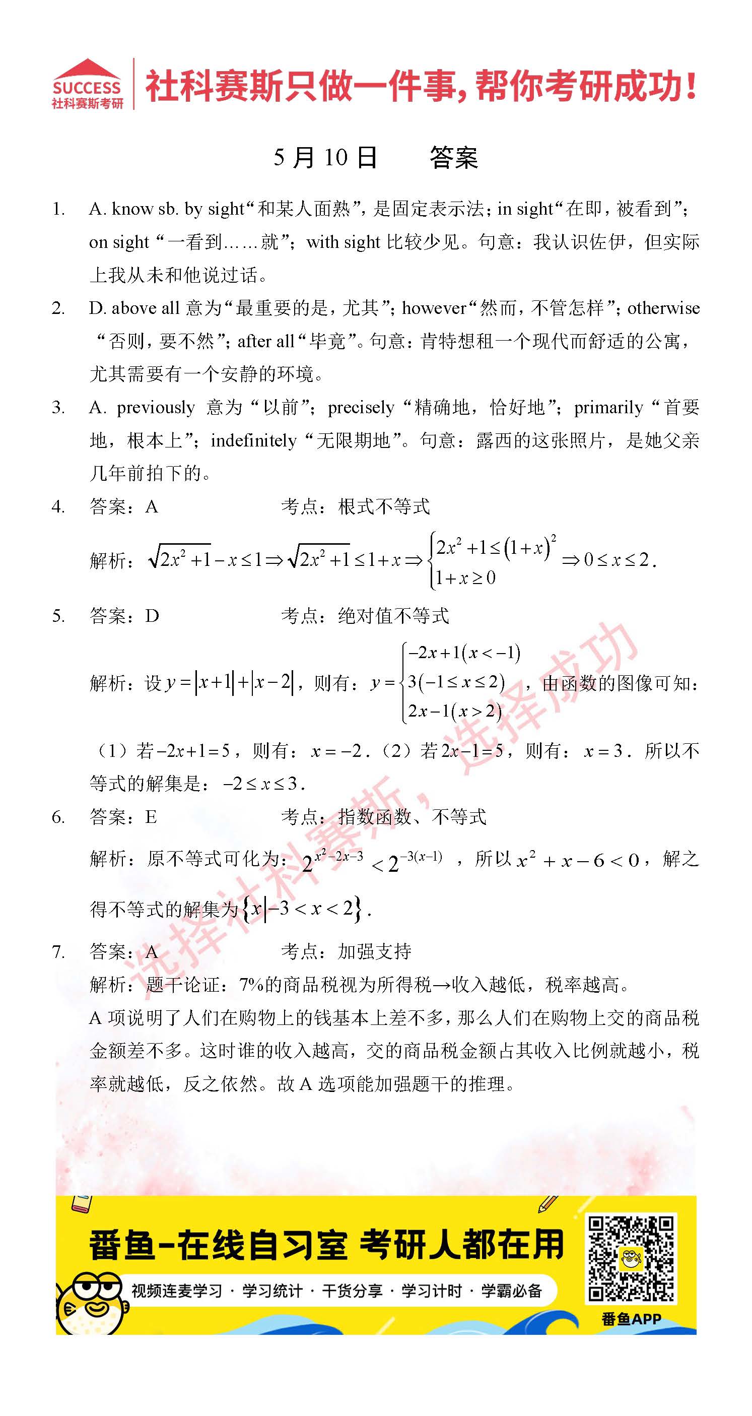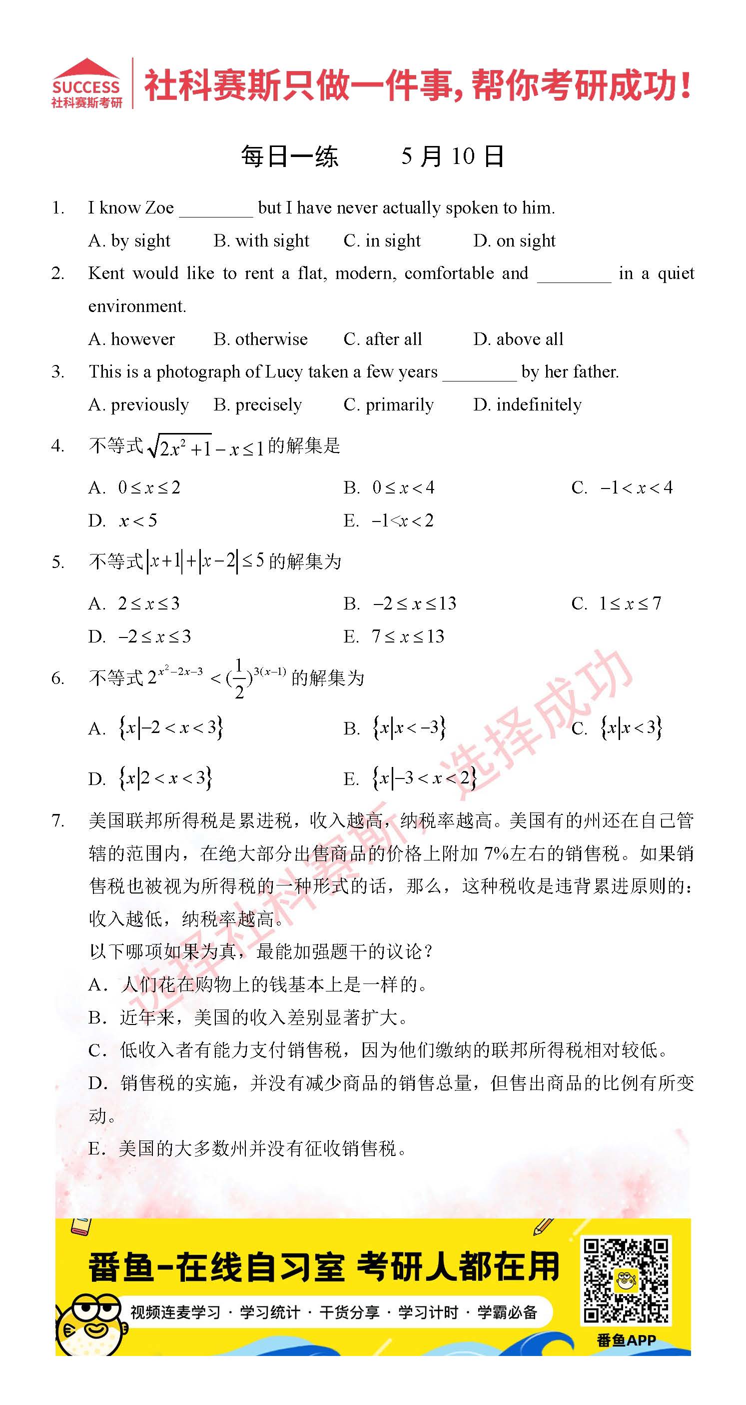 導(dǎo)讀:考研是一場(chǎng)持久戰(zhàn),保持良好的學(xué)習(xí)習(xí)慣,是能確保復(fù)習(xí)高效的關(guān)鍵。今天社科賽斯MBA備考網(wǎng)小編整理了“2022管理類聯(lián)考5月10日每日一練及答案”的內(nèi)容,希望能對(duì)廣大考生有所幫助。