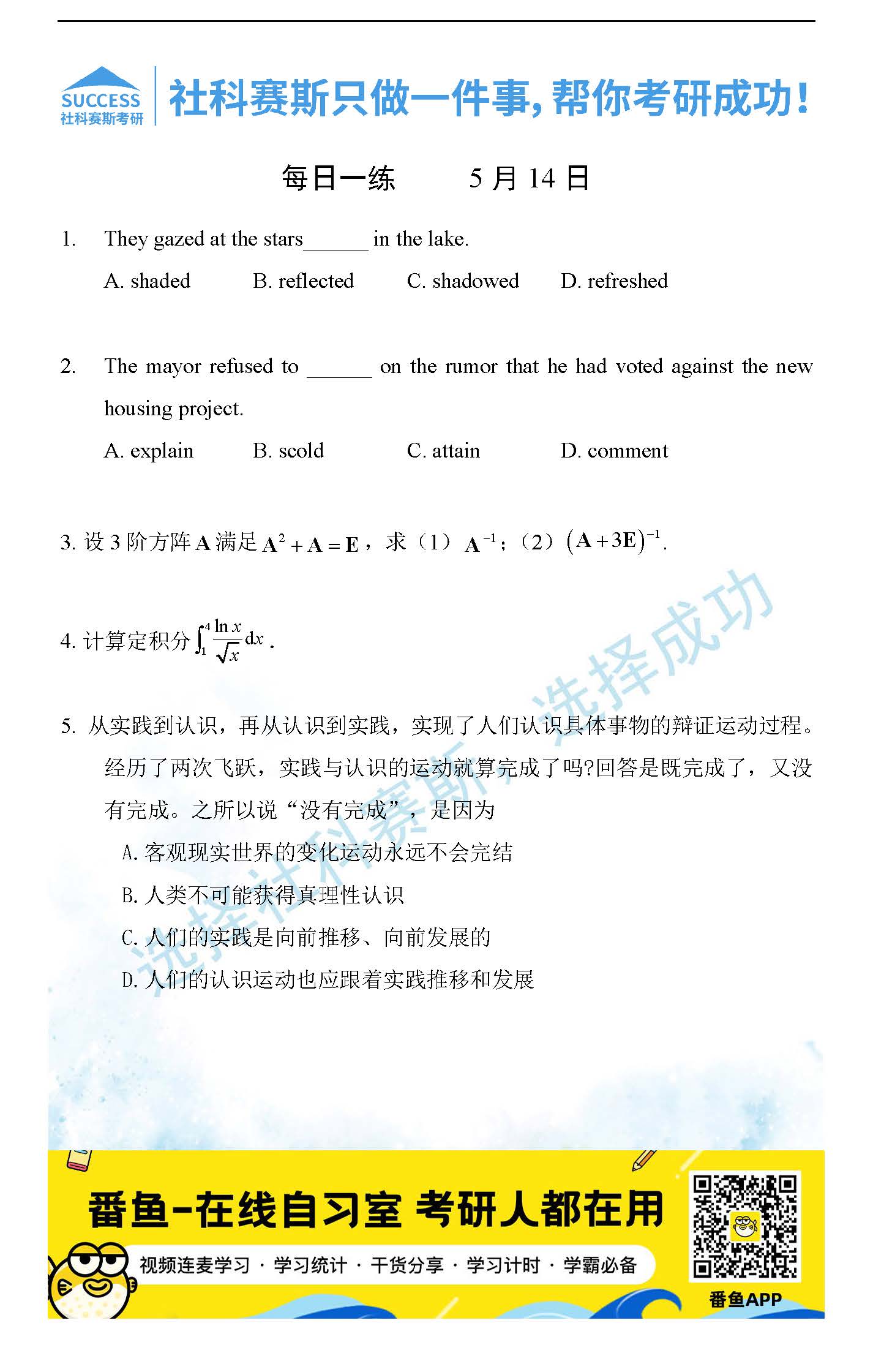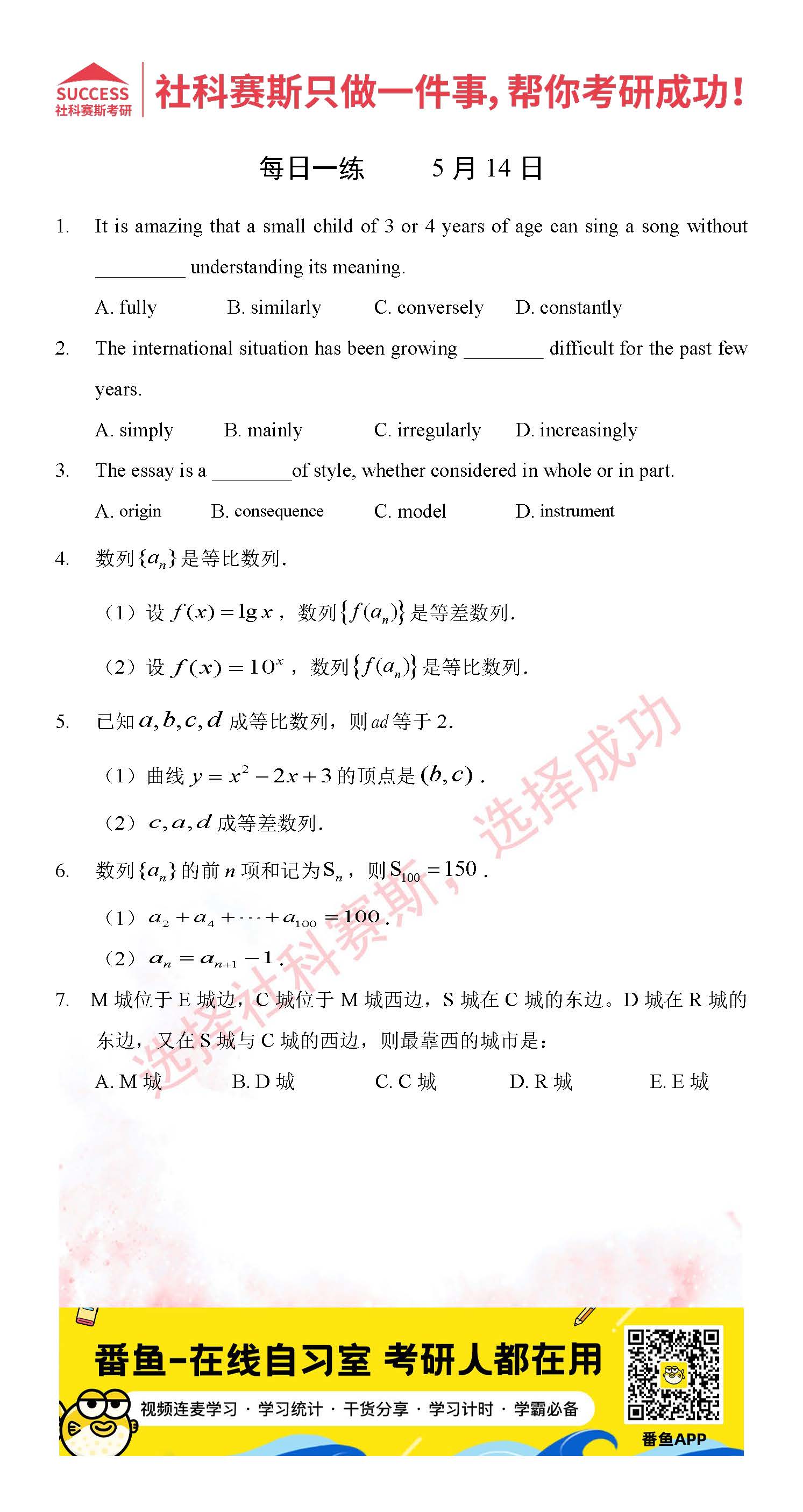 導(dǎo)讀:考研是一場持久戰(zhàn),保持良好的學(xué)習(xí)習(xí)慣,是能確保復(fù)習(xí)高效的關(guān)鍵。今天社科賽斯MBA備考網(wǎng)小編整理了“2022管理類聯(lián)考5月14日每日一練及答案”的內(nèi)容,希望能對廣大考生有所幫助。