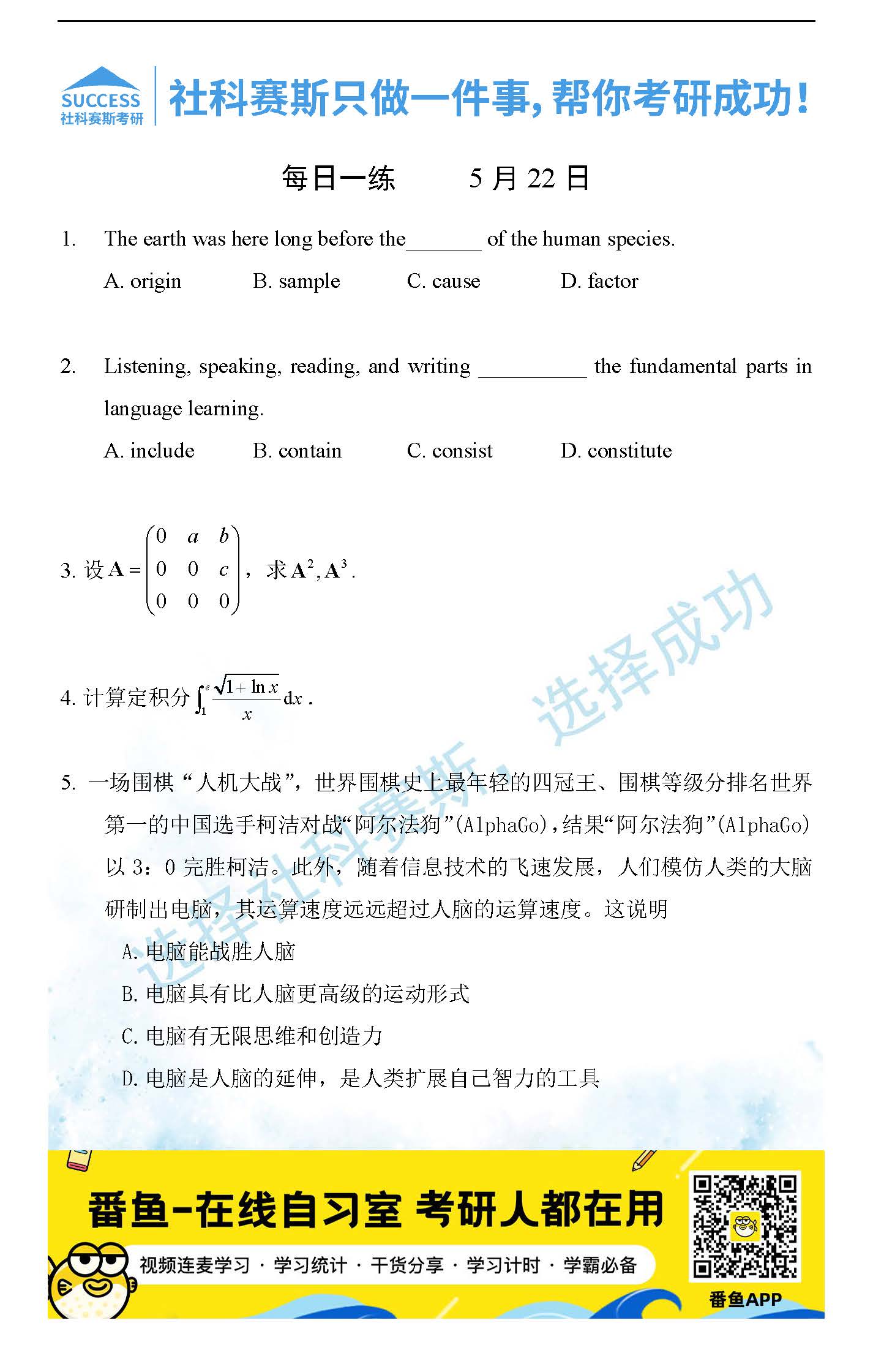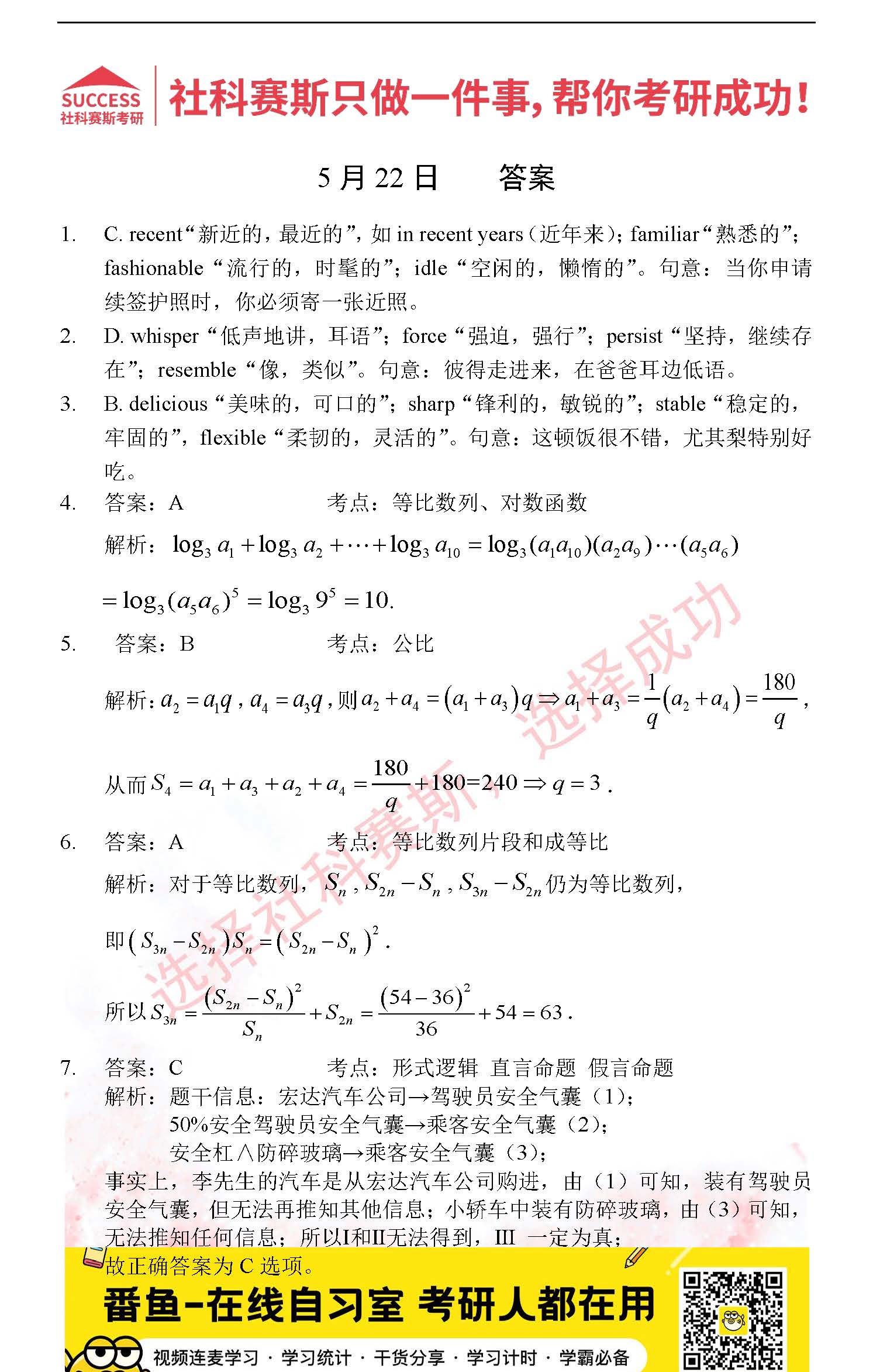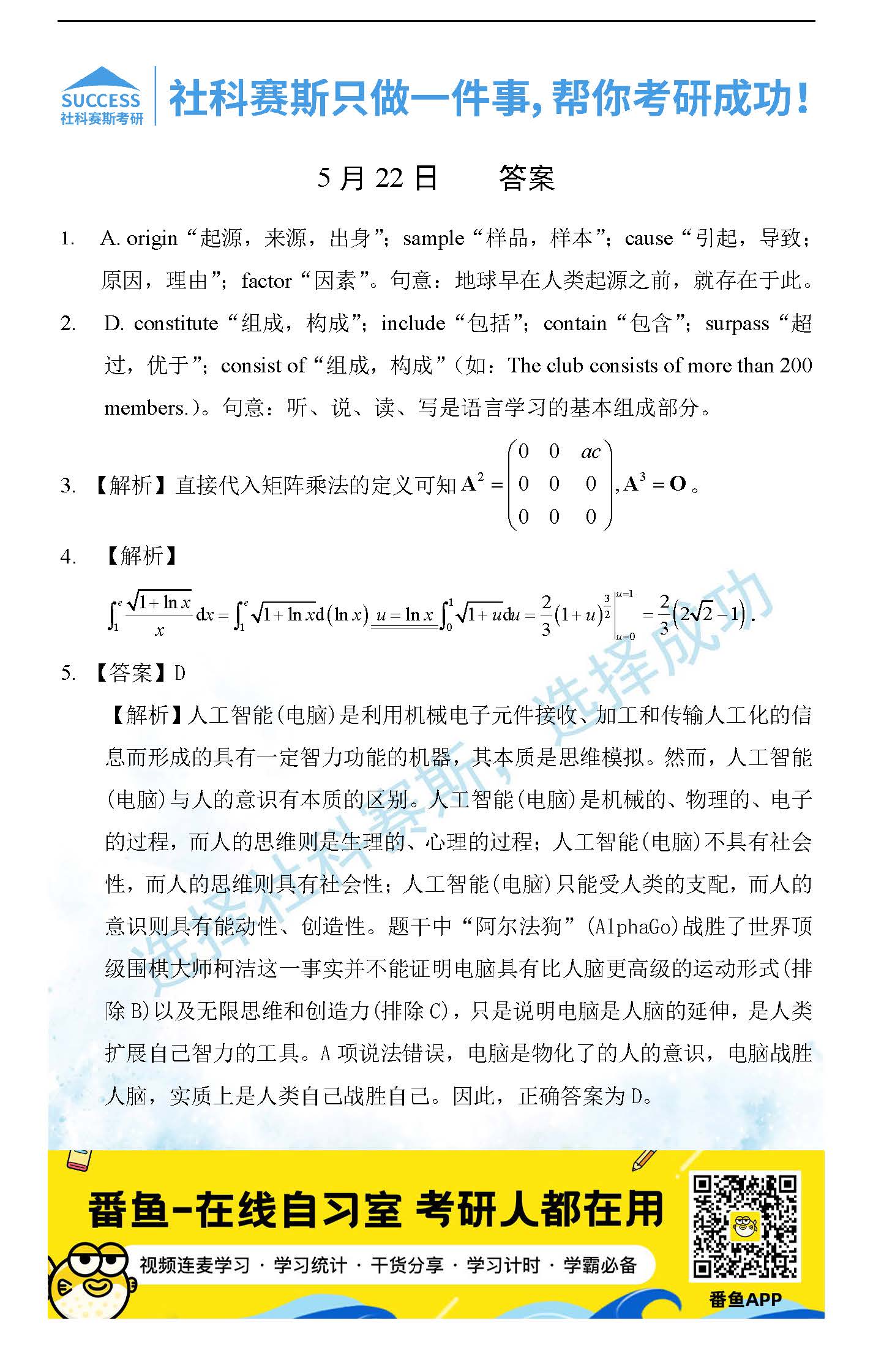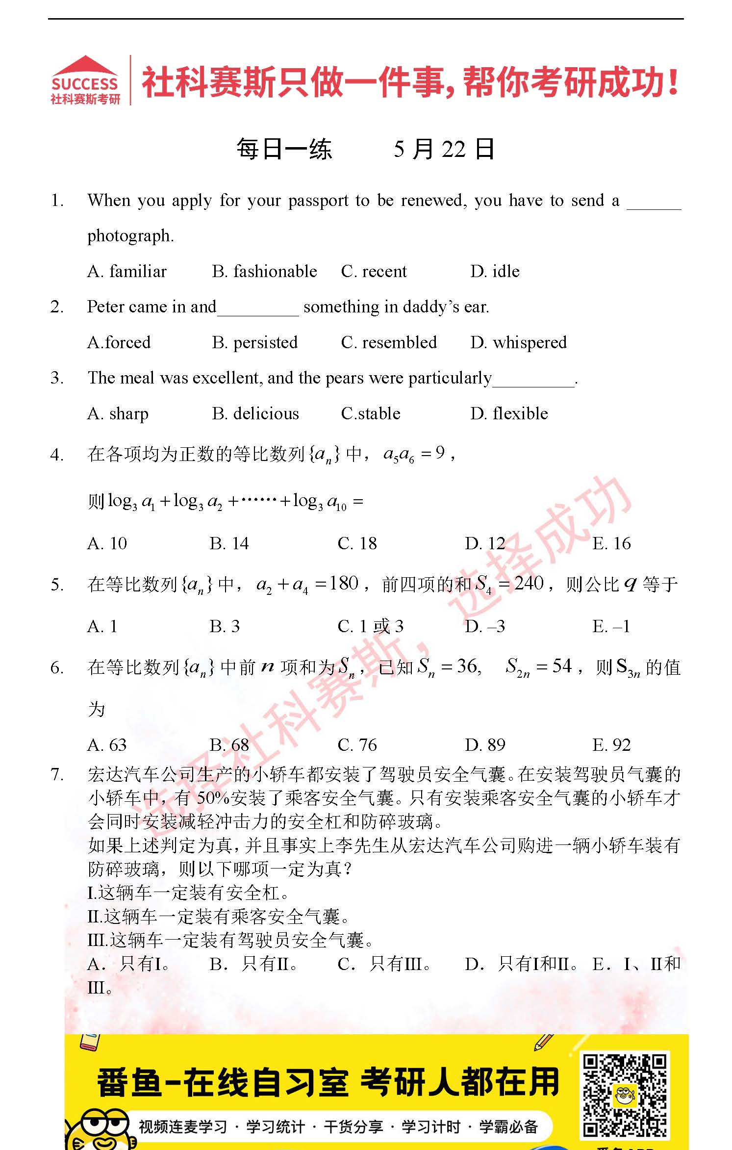 導(dǎo)讀:考研是一場(chǎng)持久戰(zhàn),保持良好的學(xué)習(xí)習(xí)慣,是能確保復(fù)習(xí)高效的關(guān)鍵。今天社科賽斯MBA備考網(wǎng)小編整理了“2022管理類(lèi)聯(lián)考5月22日每日一練及答案”的內(nèi)容,希望能對(duì)廣大考生有所幫助。