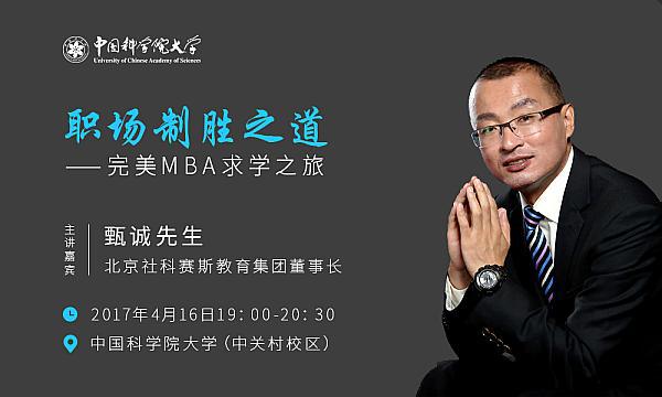 2017年4月16日(周日)19:00,中國科學(xué)院大學(xué)MBA教育中心、MBA聯(lián)合會(huì)邀請(qǐng)到社科賽斯教育集團(tuán)董事長、中國MBA教育網(wǎng)總裁甄誠先生,為同學(xué)們發(fā)表“職場(chǎng)制勝之道――MBA求學(xué)之旅”的主題演講,歡迎廣大同學(xué)積極參加。