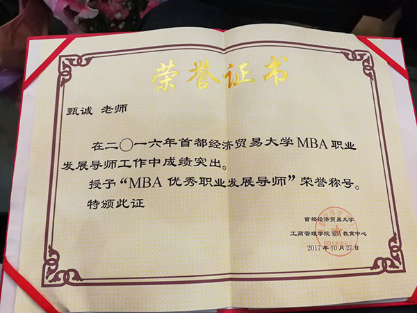 導(dǎo)讀:2017年10月27日下午,首都經(jīng)濟(jì)貿(mào)易大學(xué)對(duì)甄董在2016年MBA職業(yè)發(fā)展導(dǎo)師的工作表示肯定,甄誠董事長被授予首經(jīng)貿(mào)“MBA優(yōu)秀職業(yè)發(fā)展導(dǎo)師”榮譽(yù)稱號(hào)。