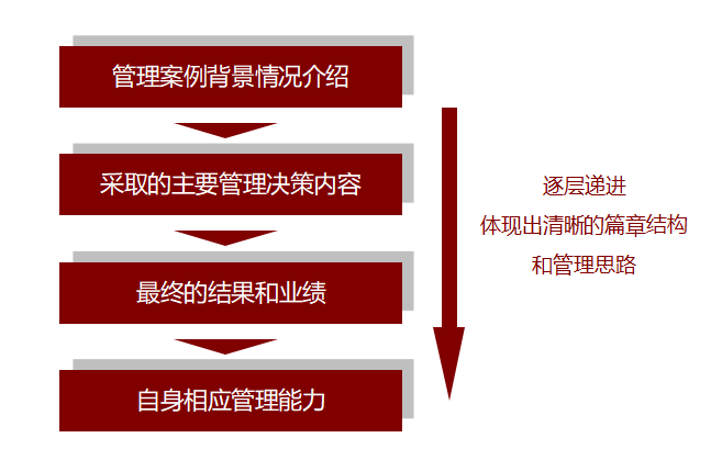 本文的實際案例部分對整體的材料審核打分也很關(guān)鍵,申請人應(yīng)當(dāng)注意以下核心問題:(1)切忌寫成流水賬,應(yīng)當(dāng)按照較為清晰的文章段落篇章架構(gòu);(2)應(yīng)當(dāng)有較為清晰的管理決策內(nèi)容和管理思路;(3)實際案例應(yīng)當(dāng)體現(xiàn)出深刻的管理思維和出眾的管理決策能力;(4)內(nèi)容切忌空洞,應(yīng)當(dāng)有較為豐富、切實的管理情境和行業(yè)背景的體現(xiàn)。