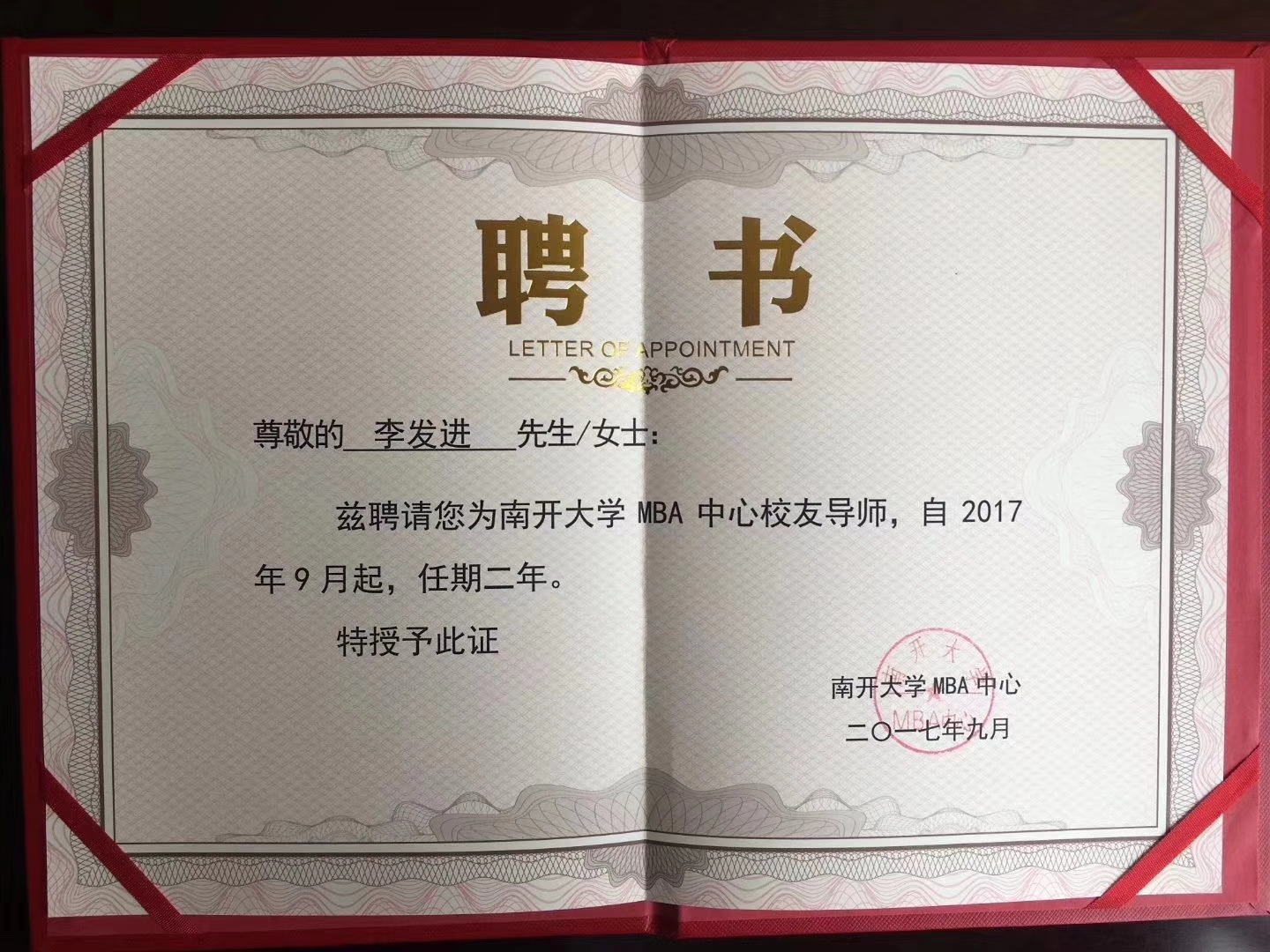 2017年李發(fā)進(jìn)校長(zhǎng)被南開大學(xué)聘為校友導(dǎo)師