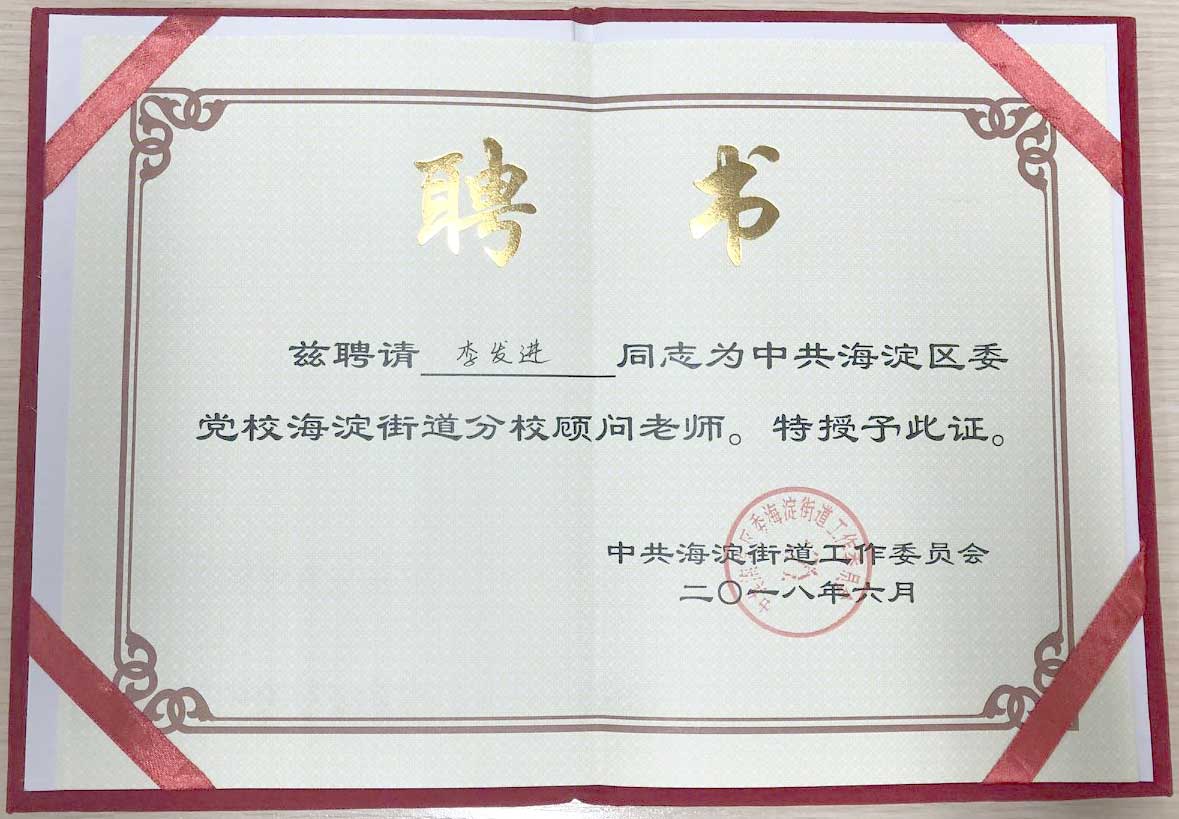 北京北京社科賽斯黨支部書記李發(fā)進(jìn)被評(píng)為海淀街道分校顧問老師