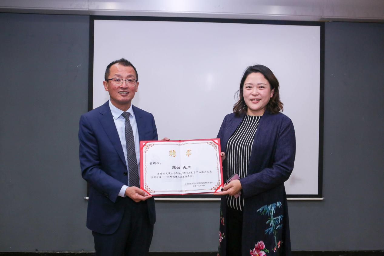 本次講座由北京交通大學MBA中心張樂老師主持并為甄誠先生頒發(fā)《北京交通大學MBA/EMBA中心職業(yè)發(fā)展系列講座——職場致勝之道主講嘉賓》聘書。