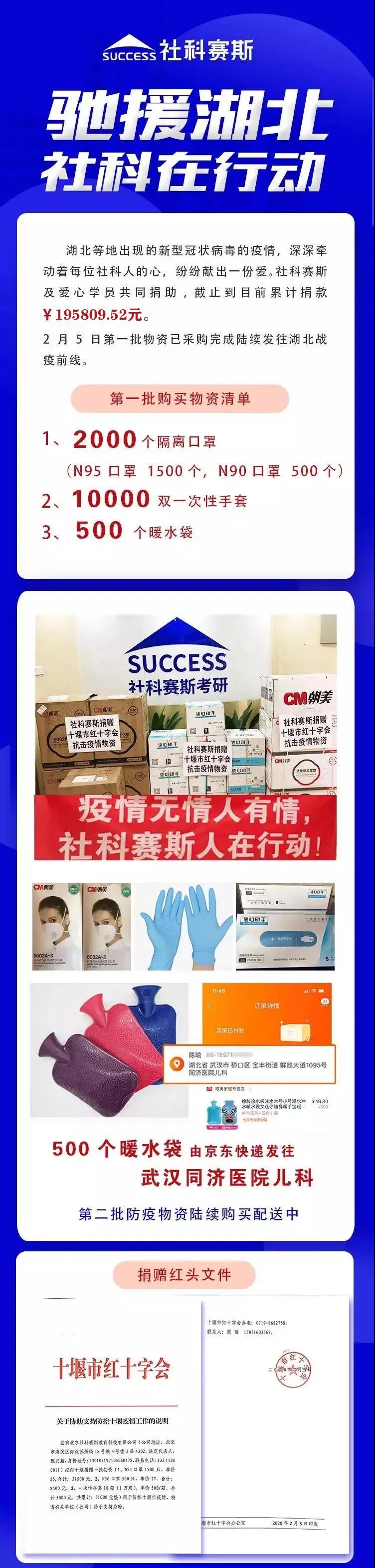 防控疫情首先就是要聽黨話、跟黨走、不信謠、不傳謠。2月4日,李書記發(fā)出了《社科賽斯疫情捐款倡議書》,之后共收到捐款195809.52元,于2月5日購買了第一批物資支援湖北十堰市,包括2000個隔離口罩、10000雙一次性手套、500個暖水袋,余款正在進行第二批物資的購買。其中黨員捐款31616元,黨支部已通過海淀街道捐贈給疫情災區(qū)。