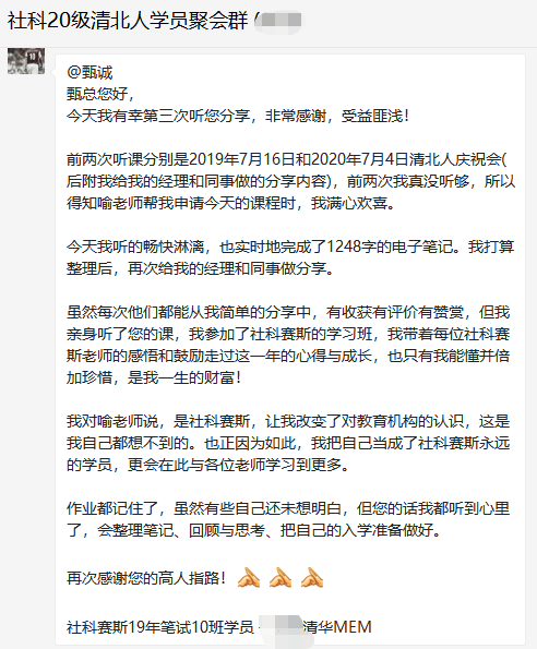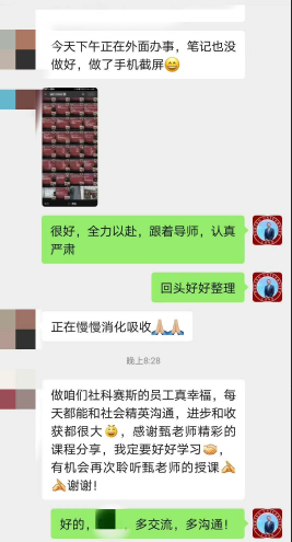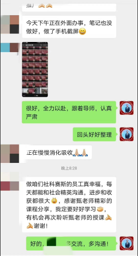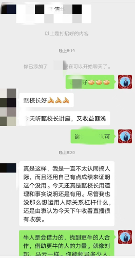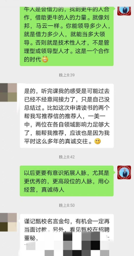 “你認(rèn)識的人有多少,你的世界就有多大”。甄總認(rèn)為,結(jié)交高人成大事,結(jié)交小人不壞事,要拒絕無效社交。甄總建議,把微信當(dāng)做人脈拓展的利器,并展示了和多位學(xué)員的聊天記錄,向大家示范了微信溝通過程中必備的措辭,結(jié)構(gòu),語氣等,內(nèi)容極為精彩。