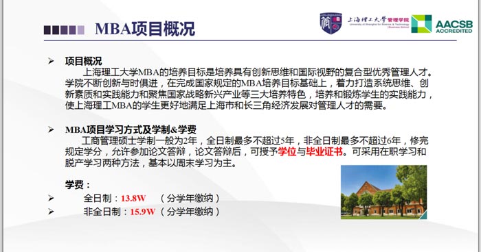 上海理工大學(xué)MBA以培養(yǎng)具有創(chuàng)新思維和國際視野的復(fù)合型優(yōu)秀管理人才為目標(biāo)。上海理工大學(xué)管理學(xué)院專業(yè)學(xué)位教育中心辦公室主任王永聯(lián)老師表示,學(xué)院不斷創(chuàng)新與時俱進(jìn),著力打造系統(tǒng)思維、創(chuàng)新素質(zhì)和實踐能力和聚焦國家戰(zhàn)略新興產(chǎn)業(yè)等三大培養(yǎng)特色,培養(yǎng)和鍛煉學(xué)生的實踐能力,使上海理工MBA的學(xué)生更好地滿足上海市和長三角經(jīng)濟(jì)發(fā)展對管理人才的需要。