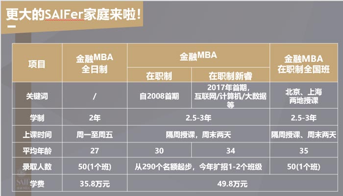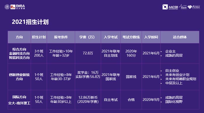 上海交通大學(xué)上海高級金融學(xué)院MBA招生經(jīng)理徐好老師表示,上海交通大學(xué)上海高級金融學(xué)院以“金融黃埔,智領(lǐng)未來”為定位,按照國際一流商學(xué)院模式創(chuàng)辦,打造中國的世界級金融學(xué)院,培養(yǎng)通曉現(xiàn)代金融知識的復(fù)合型管理人才。徐好老師指出,高金FMBA開設(shè)金融+五大課程方向,通過頂尖師資、高金領(lǐng)航計劃,形成了獨有的高金圈。她強調(diào),金融MBA在職班和在職新睿班級2021招生將擴(kuò)招1-2個班級,積極為廣大考生提供更多的學(xué)習(xí)機(jī)會。