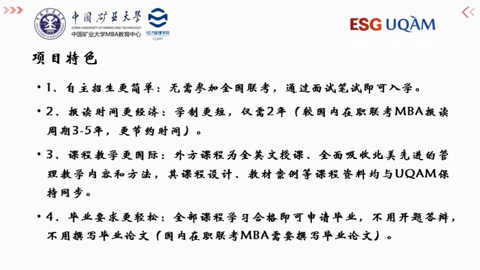 扎根能源行業(yè),服務(wù)區(qū)域經(jīng)濟(jì)。中國礦業(yè)大學(xué)MBA招生部主任、中加MBA項目招生主管張一凡結(jié)合學(xué)院發(fā)展概況與特色優(yōu)勢,進(jìn)行項目解讀,并就中加MBA項目做重點說明。中國礦業(yè)大學(xué)與加拿大魁北克大學(xué)蒙特利爾校區(qū)合作舉辦的工商管理碩士學(xué)位教育項目于2013年通過教育部中外合作辦學(xué)合格評估,,是江蘇省僅有的兩個MBA中外合作辦學(xué)項目之一。張一凡老師指出,中加MBA實行自主招生,免聯(lián)考入學(xué),多年來培養(yǎng)學(xué)生獲得了社會高度認(rèn)可,歡迎更多考生走進(jìn)礦大MBA,走進(jìn)中加MBA。