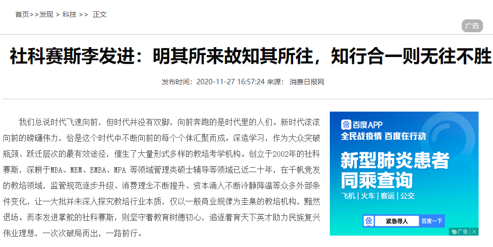 我們總說時(shí)代飛速向前,但時(shí)代并沒有雙腳,向前奔跑的是時(shí)代里的人們。新時(shí)代滾滾向前的磅礴偉力,恰是這個(gè)時(shí)代中不斷向前的每個(gè)個(gè)體匯聚而成。深造學(xué)習(xí),作為大眾突破瓶頸、躍遷層次的最有效途徑,催生了大量形式多樣的教培考學(xué)機(jī)構(gòu)。創(chuàng)立于2002年的社科賽斯,深耕于MBA、MEM、EMBA、MPA 等領(lǐng)域管理類碩士輔導(dǎo)等領(lǐng)域已近二十年,在千帆競發(fā)的教培領(lǐng)域,監(jiān)管規(guī)范逐步升級(jí)、消費(fèi)理念不斷提升、資本涌入不斷冷靜降溫等眾多外部條件變化,讓一大批并未深入探究教培行業(yè)本質(zhì),僅以一般商業(yè)規(guī)律為圭臬的教培機(jī)構(gòu),黯然退場。而李發(fā)進(jìn)掌舵的社科賽斯,則堅(jiān)守著樹德初心,追逐著育天下英才助力民族復(fù)興偉業(yè)理想,一次次破局而出,一路前行。