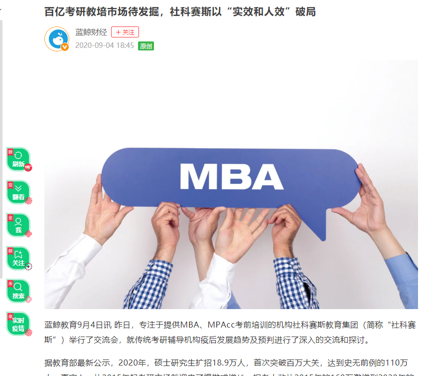 藍(lán)鯨教育9月4日訊 昨日,專注于提供MBA、MPAcc考前培訓(xùn)的機(jī)構(gòu)社科賽斯集團(tuán)(簡稱“社科賽斯”)舉行了交流會(huì),就傳統(tǒng)考研輔導(dǎo)機(jī)構(gòu)疫后發(fā)展趨勢(shì)及預(yù)判進(jìn)行了深入的交流和探討。