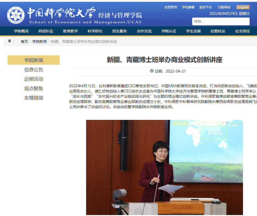 2022年4月15日,社科賽斯教育集團CEO兼黨支部書記、中國MBA教育網(wǎng)總裁李發(fā)進,叮當快藥聯(lián)合創(chuàng)始人、飛鶴乳業(yè)高級合伙人、德匯好物創(chuàng)始人兼CEO徐歡生應(yīng)邀為中國科學院大學經(jīng)濟與管理學院新疆博士班、青藏博士班帶來以“成長與困惑”“鄉(xiāng)村振興的全產(chǎn)業(yè)鏈實踐與研究”為主題的商業(yè)模式創(chuàng)新講座。中科聞歌首席戰(zhàn)略官兼數(shù)智商業(yè)事業(yè)部總經(jīng)理郭驊、副總裁兼數(shù)智商業(yè)事業(yè)部副總經(jīng)理汪小東、中科聞歌中科智庫研究院副院長兼西安聞歌總經(jīng)理吳曉飛線上同步參與了講座的討論。講座由經(jīng)管學院副院長喬晗教授主持。