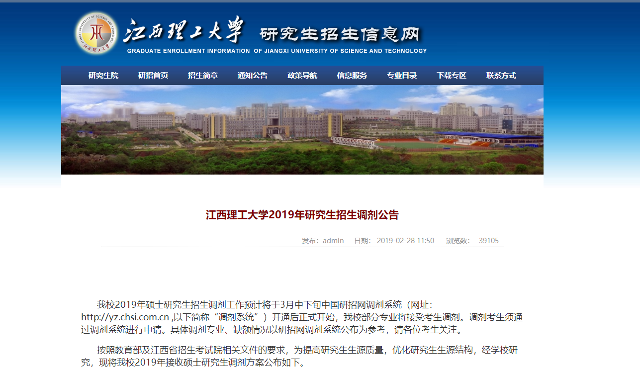 按照教育部及江西省招生考試院相關(guān)文件的要求,為提高研究生生源質(zhì)量,優(yōu)化研究生生源結(jié)構(gòu),經(jīng)學(xué)校研究,現(xiàn)將我校2019年接收碩士研究生調(diào)劑方案公布如下。