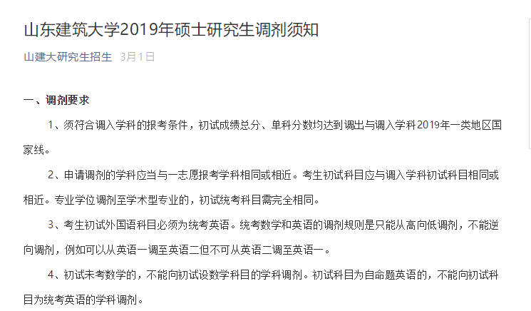 1、須符合調(diào)入學(xué)科的報考條件,初試成績總分、單科分?jǐn)?shù)均達到調(diào)出與調(diào)入學(xué)科2019年一類地區(qū)國家線。