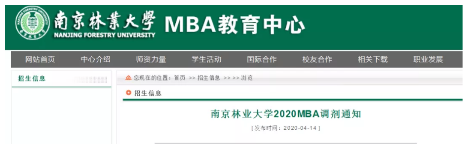 根據(jù)南京林業(yè)大學(xué)學(xué)科建設(shè)與學(xué)位點(diǎn)發(fā)展的需要,我校工商管理碩士(MBA)專業(yè)目前還有部分調(diào)劑名額,接收2020年校外調(diào)劑考生,請有意向調(diào)劑到南京林業(yè)大學(xué)攻讀MBA學(xué)位的考生按照以下要求辦理調(diào)劑事宜。