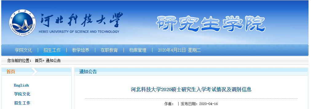 關(guān)于河北科技大學(xué)2020碩士研究生調(diào)劑的信息
