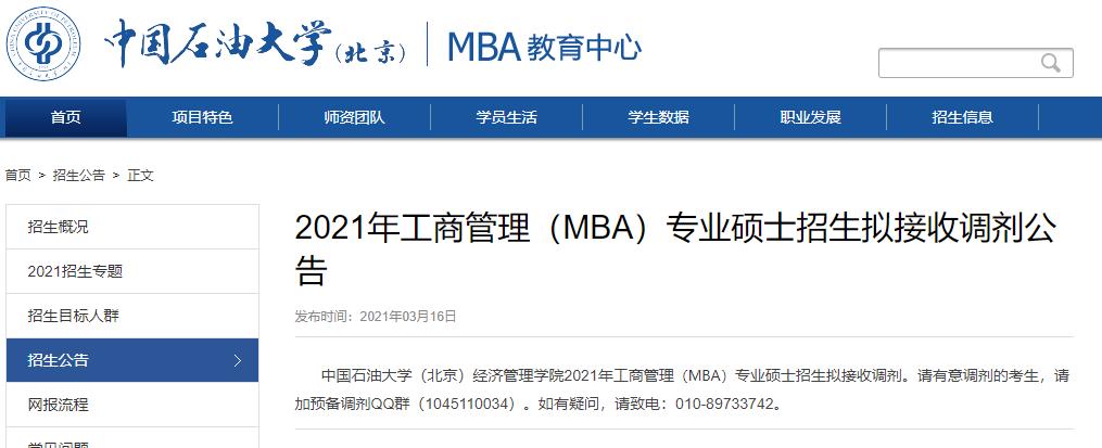 導(dǎo)讀:近期部分院校已開啟“預(yù)調(diào)劑系統(tǒng)”,下面為同學(xué)們整理出“2021MBA調(diào)劑:中國石油大學(xué)(北京)2021年工商管理(MBA)專業(yè)碩士招生擬接收調(diào)劑公告”的相關(guān)信息,趕緊一起看看,把握好時(shí)機(jī),今年升研一吧!