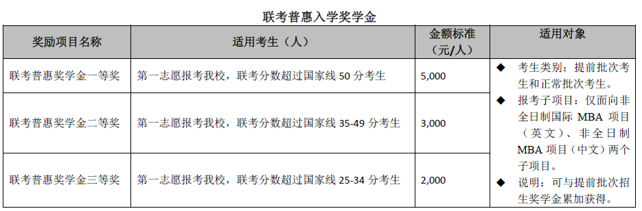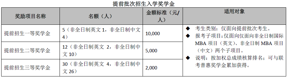 設立四種類別入學獎學金,以資鼓勵報考我校MBA項目、全國聯(lián)考初試分數(shù)成績優(yōu)秀、提前批次招生面試表現(xiàn)出色的考生。