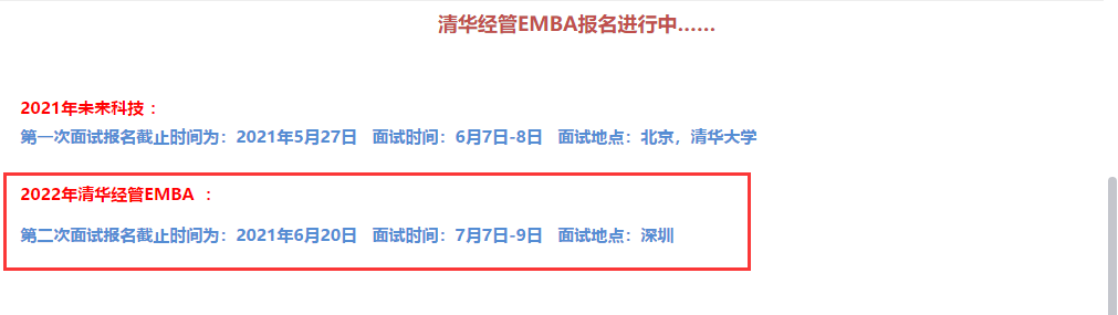 2022年清華經(jīng)管EMBA第二次面試報名截止時間為:2021年6月20日