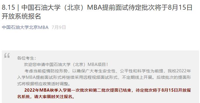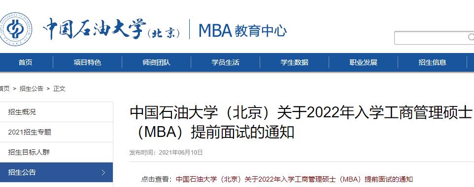 原文標題:中國石油大學(北京)關于2022年入學工商管理碩士(MBA)提前面試的通知