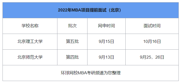 以上就是“2022MBA提前面試:2022年9月份第3周北京地區(qū)2所985院校MBA提前面試可以申請(qǐng)”,更多相關(guān)信息,請(qǐng)持續(xù)關(guān)注本網(wǎng)站!