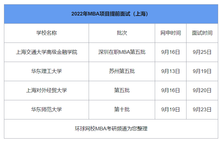 以上就是“2022MBA提前面試:2022年MBA提前面試:9月份第三周上海地區(qū)4所院校將截止申請(qǐng)”,更多相關(guān)信息,請(qǐng)持續(xù)關(guān)注本網(wǎng)站!
