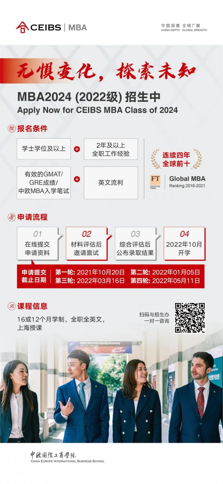中歐MBA2022級(2022年10月入學(xué))第二輪申請倒計(jì)時最后一個星期截止!你的申請材料都準(zhǔn)備好了嗎?想和招生老師聊聊你的申請,請聯(lián)系021-28905555,或掃描下圖二維碼預(yù)約與中歐MBA招生老師一對一咨詢。