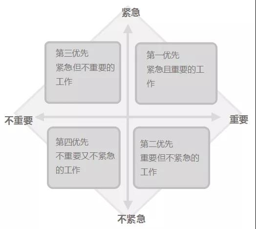 按照這樣的劃分,四個(gè)象限分別為:緊急且重要的工作、重要但不緊急的工作、緊急但不重要的工作、不重要又不緊急的工作: