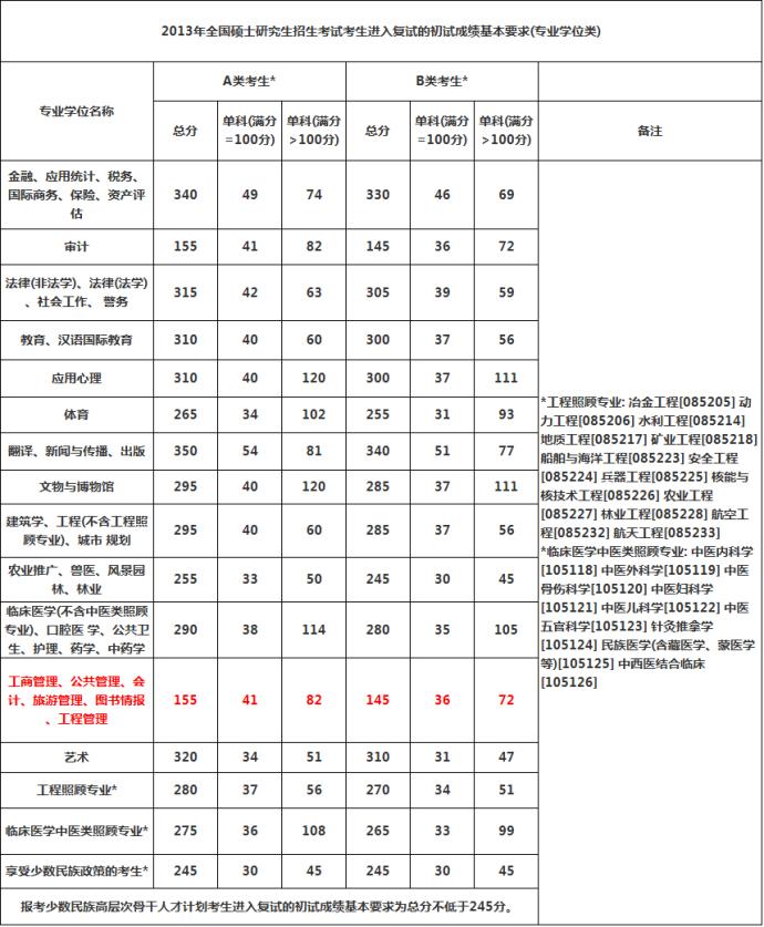 2013年工商管理碩士A類院校總分為155分 B類院??偡譃?45分,詳情請(qǐng)見下表: