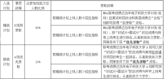 (1)入選精銳計劃且當(dāng)年第一志愿報考電子科技大學(xué)MBA(英語、綜合兩科均有成績)的考生,聯(lián)考成績?nèi)粑催_到我校B線,該“B線預(yù)錄取”資格可保留至第二年。