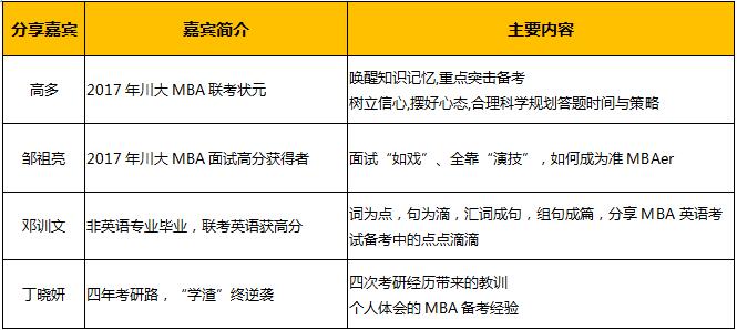 導讀:幫助廣大考生掌握四川大學商學院MBA項目2018年招生政策,提高備考和學習效率,中心將于10月15日舉辦2018年招生說明暨備考經驗分享會。屆時,川大MBA2017年入學聯(lián)考狀元、入學獎學金獲得者、通過備考復習成績大幅提升的多名同學將帶來他們寶貴的備考經驗與學習心得分享,歡迎各位考生勇躍參加。因場地有限,參加者須于10月13日中午12:00點前在中心網站上進行預約