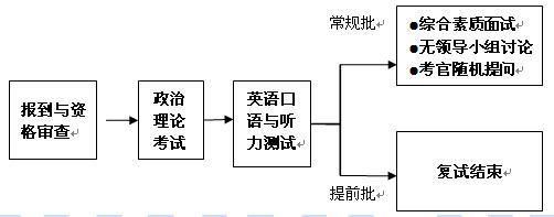 復試分為政治理論筆試、英語口語與聽力測試、綜合素質面試三部分,總分為300分。