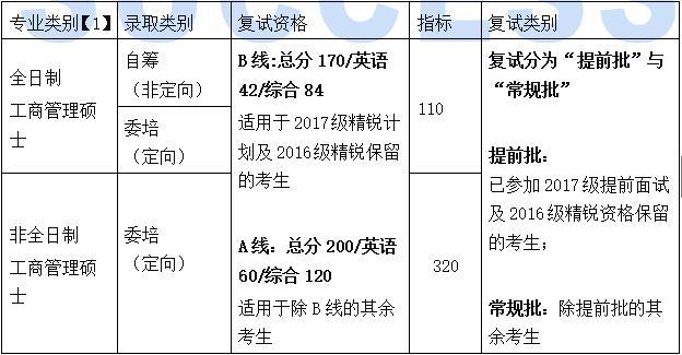 (1)所有參加面試考生按照全日制工商管理碩士、非全日制工商管理碩士分別排名,按優(yōu)先錄取第一專業(yè)志愿考生(即在中國研究生招生信息網上所填報的專業(yè)類別)原則,以總成績(聯考成績×50%+復試成績×50%)實行從高到低順序錄取,總成績相同的考生,則按照考生類別(即精銳計劃、新銳計劃、未參加提前面試的考生)依次進行錄取。同一類別考生,若總成績相同,則按照“政治+英語”的復試成績進行排名,從高到低依次錄取。