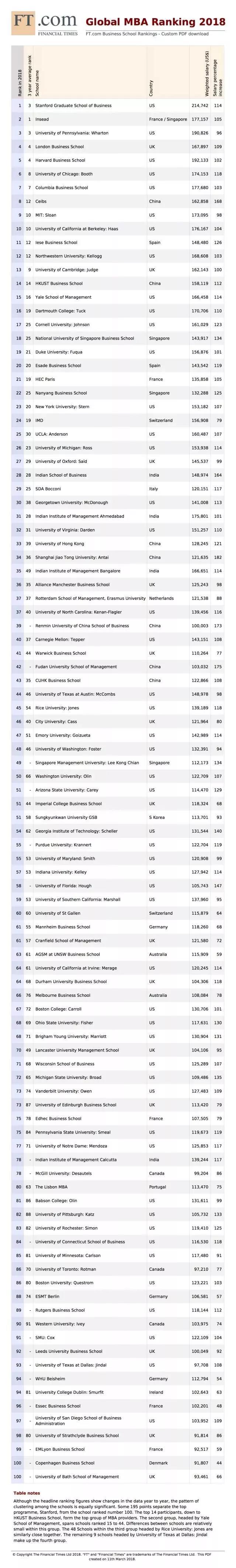 前十名的學校基本不變,只是各自排名略有浮動。第一名依然是斯坦福大學商學院(Stanford Graduate School of Business),歐洲工商管理學院(Insead)比去年降低一位,排名第二。賓夕法尼亞大學沃頓商學院(University of Pennsylvania:Wharton)在榜單中的排位與去年持平,位居第三。倫敦商學院(London Business School)位列第四,比去年提升兩位,這也是英國排名最靠前的MBA。哈佛商學院(Harvard Business School)下降到第五名,這是其自2008年以來最低排名。與此同時,劍橋大學(Universityof Cambridge)佳奇商學院(Judge BusinessSchool)一年制MBA下滑8位,至第13名。