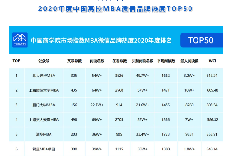 中國MBA教育網(wǎng)《TOP50中國商學(xué)院MBA品牌官方微信公眾號(hào)熱度排行榜單》排名主要依據(jù)2020年度全國各MBA培養(yǎng)院校公眾號(hào)、清博指數(shù)(以WCI為加權(quán)指標(biāo))的數(shù)據(jù)來計(jì)算排名。統(tǒng)計(jì)時(shí)段為2019年12月1日0時(shí)至2020年12月1日24時(shí)。
