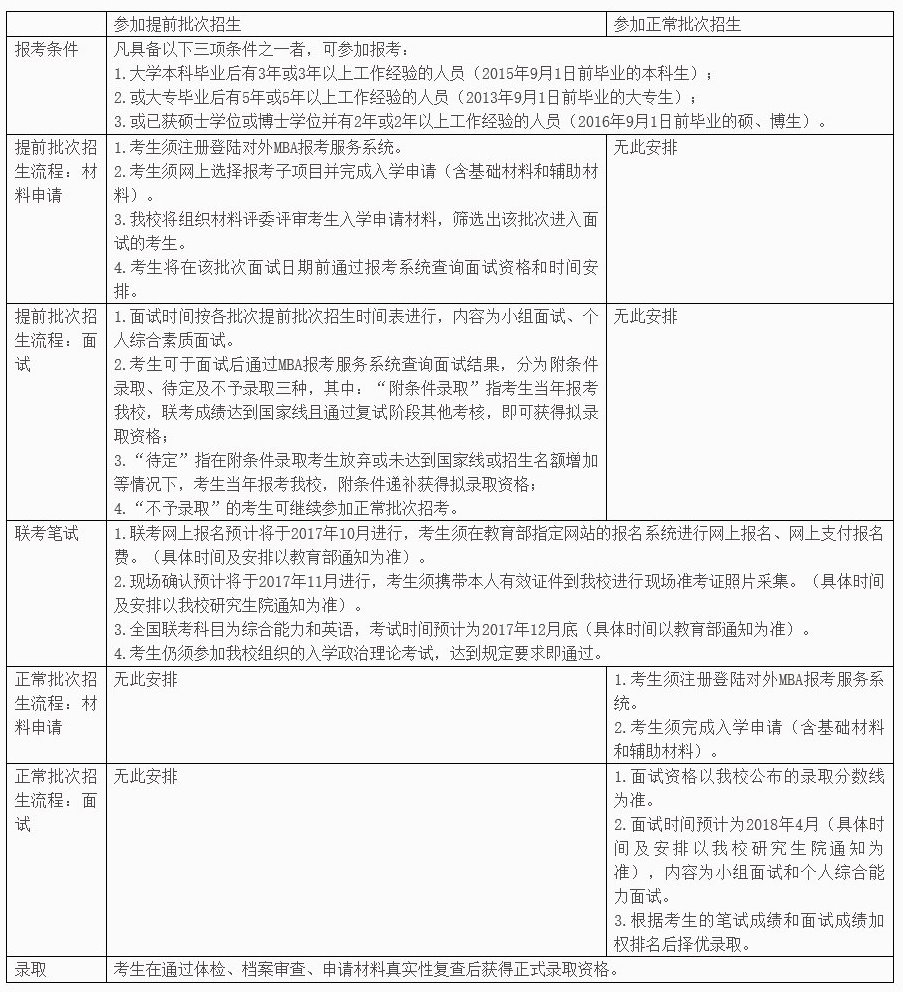 4. “MBA提前批次招生”將安排于2017年5月至11月進(jìn)行,參加提前批次招生的考生需在聯(lián)考報(bào)名前的指定期間內(nèi)在線提交申請(qǐng)材料,經(jīng)過材料評(píng)審,擇優(yōu)給予面試資格;經(jīng)過面試給予綜合素質(zhì)優(yōu)秀的考生“附條件錄取”資格;原則上,該類考生參加全國聯(lián)考成績達(dá)到國家A線即可錄取。