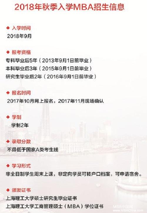 導(dǎo)讀:上海理工大學(xué)2018年MBA招生簡(jiǎn)章的招生信息如下: