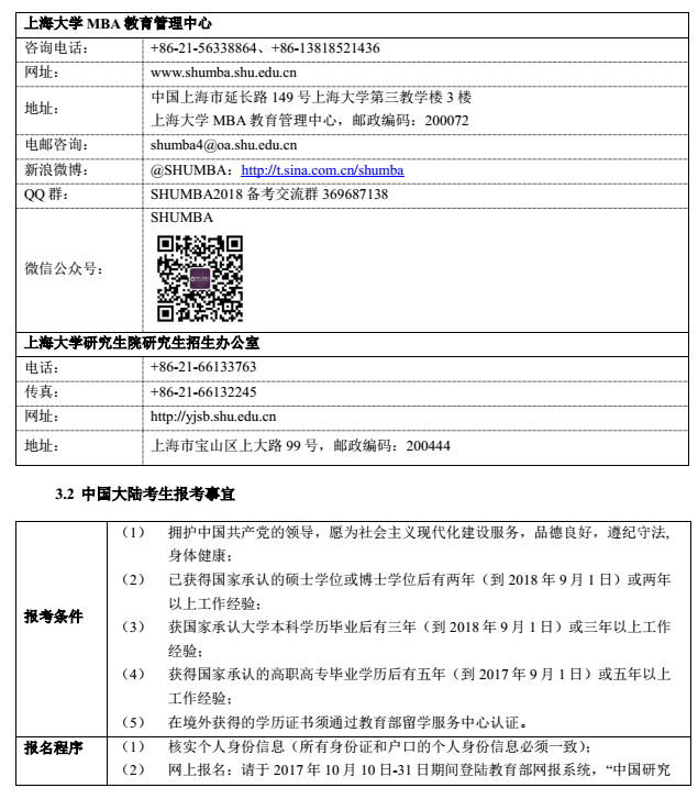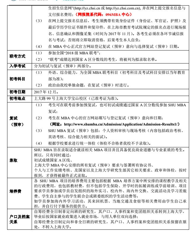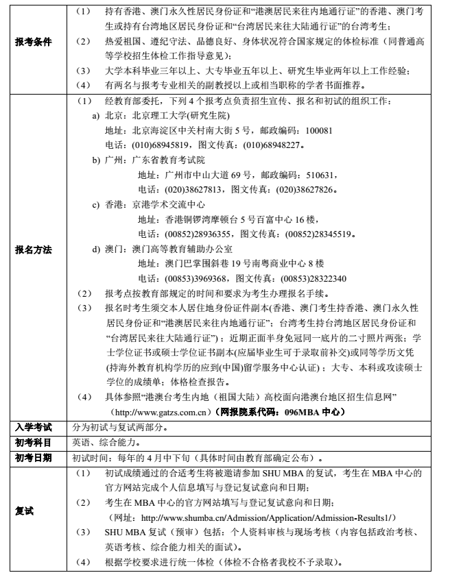 導(dǎo)讀:新一輪MBA備考開始了,各大院校也陸續(xù)公布了自己的招生簡章,下面是上海大學(xué)MBA項目招生簡章的相關(guān)內(nèi)容,提供給大家參考!