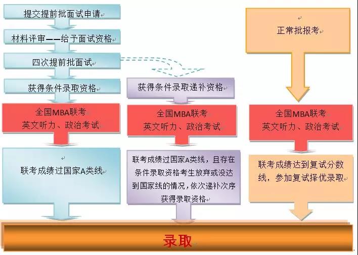 (1)獲得“條件錄取資格”的考生:當年在人大參加MBA聯(lián)考,成績達到國家A類線且政治考試和英語聽力測試通過即可獲得擬錄取資格。
