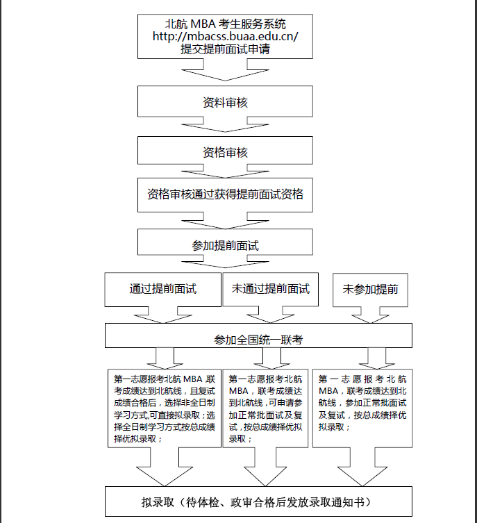 通過考生:第一志愿報考北航MBA,聯(lián)考成績達(dá)到北航線,復(fù)試成績合格,選擇非全日制學(xué)習(xí)方式可直接擬錄取;選擇全日制學(xué)習(xí)方式按總成績擇優(yōu)擬錄?。?br /> 未通過考生:第一志愿報考北航MBA,聯(lián)考成績達(dá)到北航線,可申請參加正常批面試。