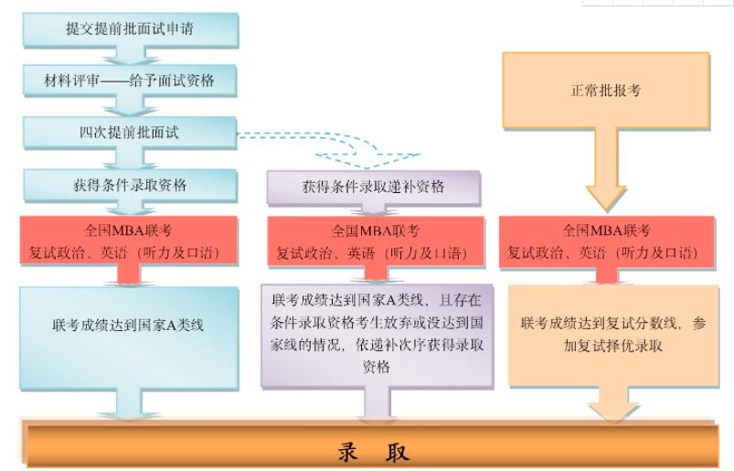 登錄中國人民大學(xué)商學(xué)院MBA項(xiàng)目中心網(wǎng)站“考生服務(wù)系統(tǒng)”,按照規(guī)定時(shí)間提交網(wǎng)上申請(qǐng)材料,學(xué)院將組織專家評(píng)審申請(qǐng)材料,擇優(yōu)給予提前面試資格并組織面試。面試后獲得條件錄取資格和條件錄取遞補(bǔ)資格的考生需參加2019年12月底舉行的全國聯(lián)考。
