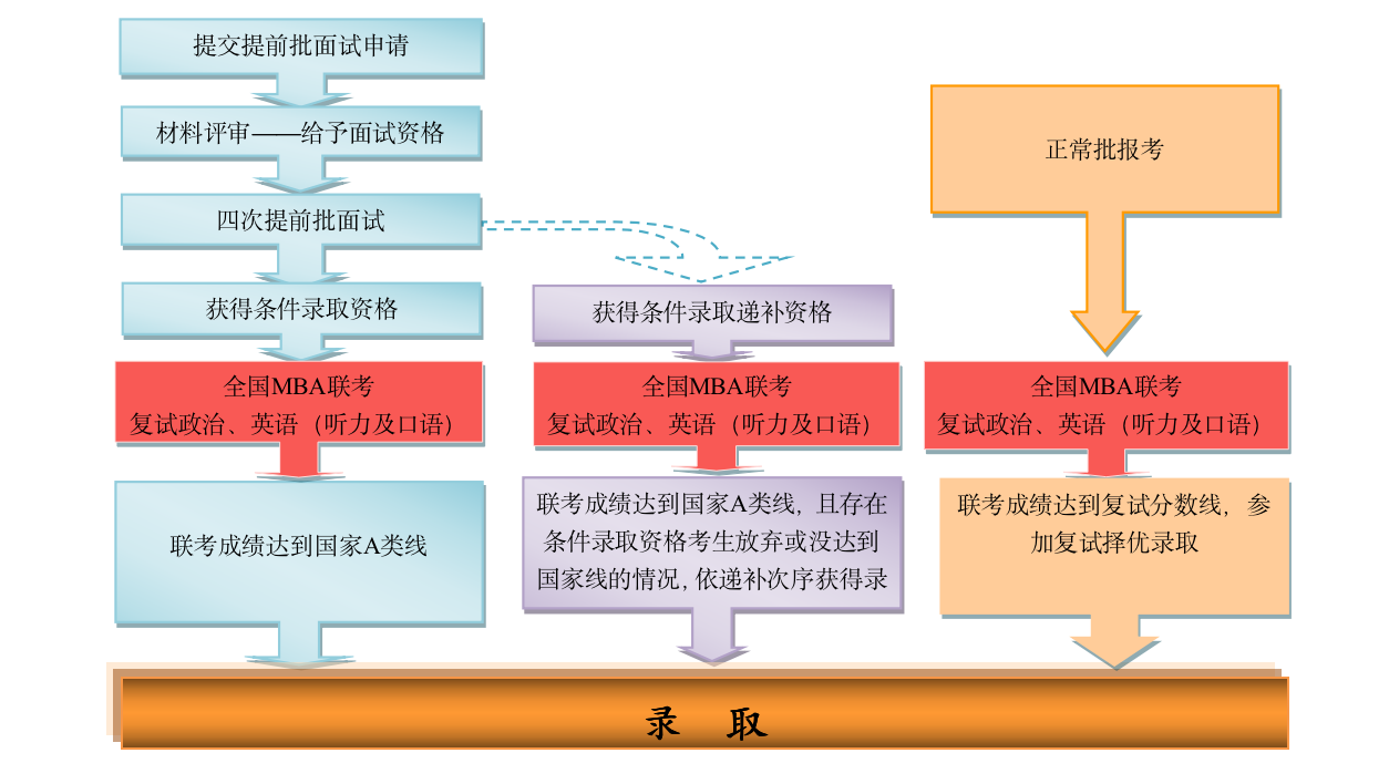 登錄中國人民大學(xué)商學(xué)院MBA項目中心網(wǎng)站“考生服務(wù)系統(tǒng)”,按照規(guī)定時間提交網(wǎng)上申請材料,學(xué)院將組織專家評審申請材料,擇優(yōu)給予提前面試資格并組織面試。面試后獲得條件錄取資格和條件錄取遞補(bǔ)資格的考生需參加2020年12月底舉行的全國聯(lián)考。
